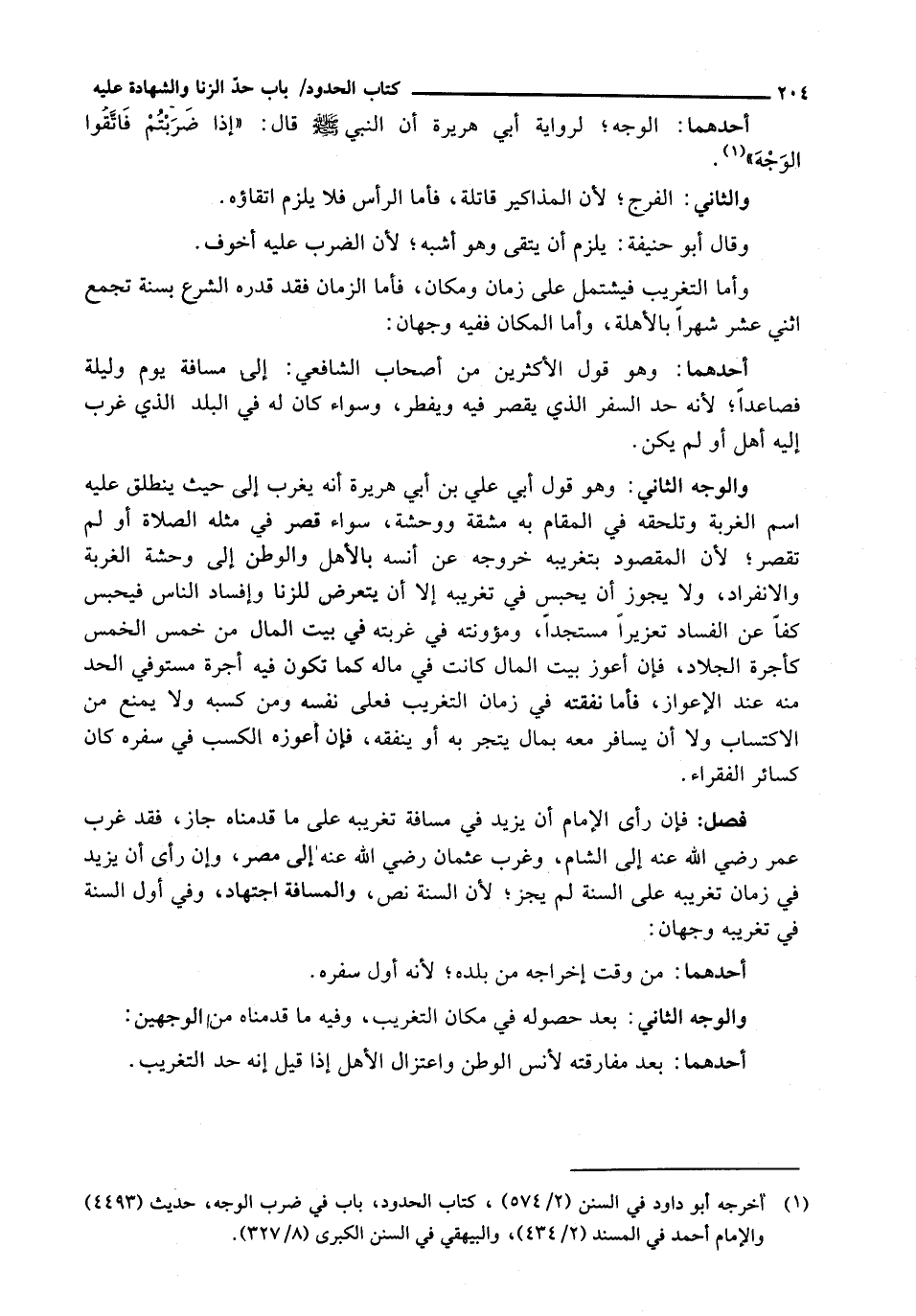 وَالْوَجْهُ الثَّانِي: وَهُوَ قَوْلُ أَبِي عَلِيِّ بْنِ أبي هريرة أنه يغرب إلى حيث ينطلق عَلَيْهِ اسْمُ الْغُرْبَةِ وَتَلْحَقُهُ فِي الْمُقَامِ بِهِ مشقة ووحشة، سواء قصر فِي مِثْلِهِ الصَّلَاةُ أَوْ لَمْ تَقْصُرْ؛ لِأَنَّ المقصود بتغريبه خروجه عن أنسه بالأهل وَالْوَطَنِ إِلَى وَحْشَةِ الْغُرْبَةِ وَالِانْفِرَادِ، وَلَا يَجُوزُ أَنْ يُحْبَسَ فِي تَغْرِيبِهِ إِلَّا أَنْ يَتَعَرَّضَ للزنا وإفساد الناس فيحبس كفا عن الفساد تعزيراً مستجداً، ومؤونته في غربته فِي بَيْتِ الْمَالِ مِنْ خُمْسِ الْخُمْسِ كَأُجْرَةِ الجلاد، فإن أعوز بيت المال كانت فِي مَالِهِ كَمَا تَكُونُ فِيهِ أُجْرَةُ مُسْتَوْفِي الْحَدِّ مِنْهُ عِنْدَ الْإِعْوَازِ، فَأَمَّا نَفَقَتُهُ فِي زَمَانِ التَّغْرِيبِ فَعَلَى نَفْسِهِ وَمِنْ كَسْبِهِ وَلَا يُمْنَعُ مِنَ الِاكْتِسَابِ وَلَا أَنْ يُسَافِرَ مَعَهُ بمال يتجر به أو ينفقه، فإن أعوزه الْكَسْبَ فِي سَفَرِهِ كَانَ كَسَائِرِ الْفُقَرَاءِ.