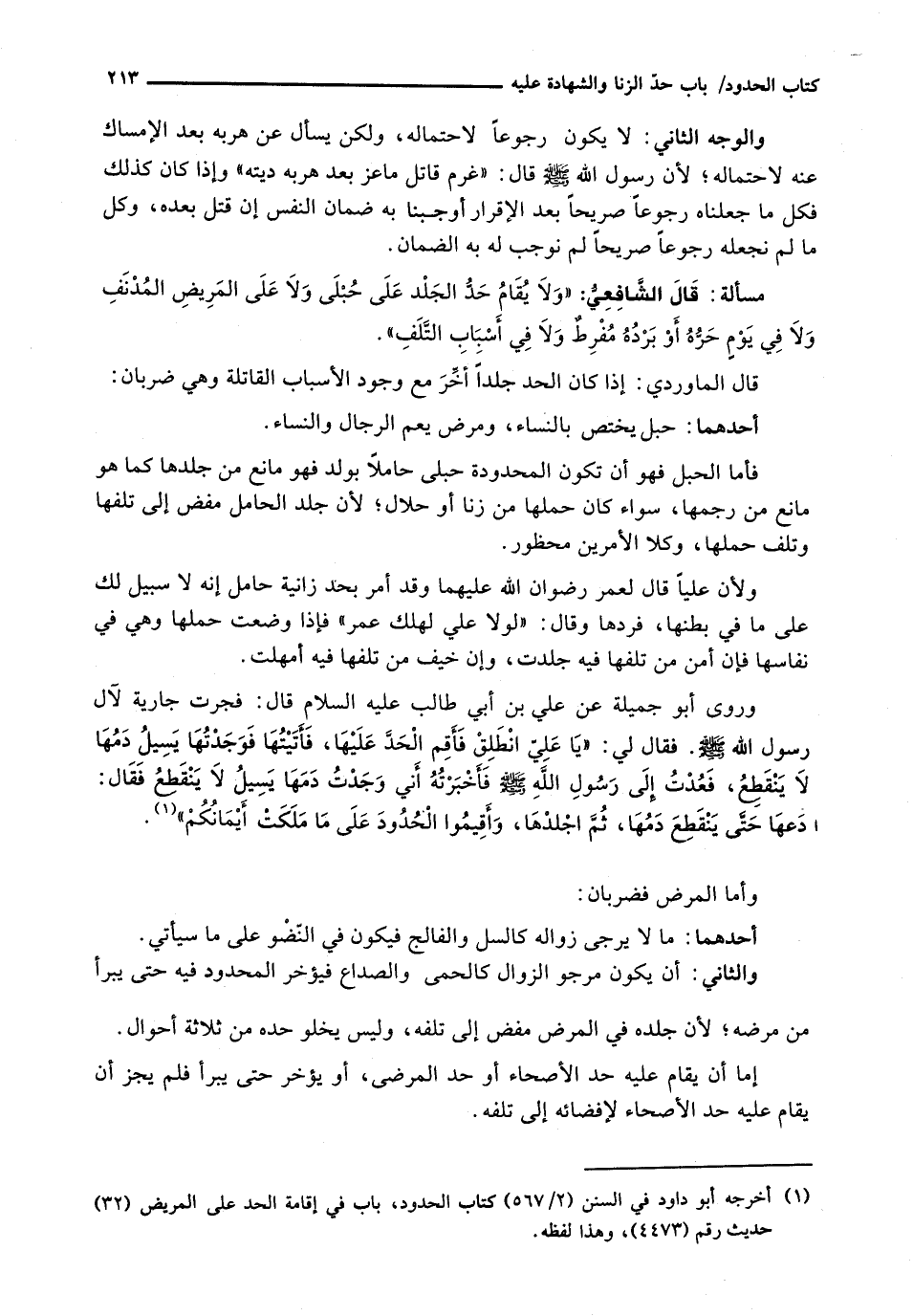 قال الشافعي: " وَلَا يُقَامُ حَدُّ الْجَلْدِ عَلَى حُبْلَى وَلَا عَلَى الْمَرِيضِ الْمُدْنَفِ وَلَا فِي يَوْمٍ حَرُّهُ أَوْ بَرْدُهُ مُفْرِطٌ وَلَا فِي أَسْبَابِ التَّلَفِ) .