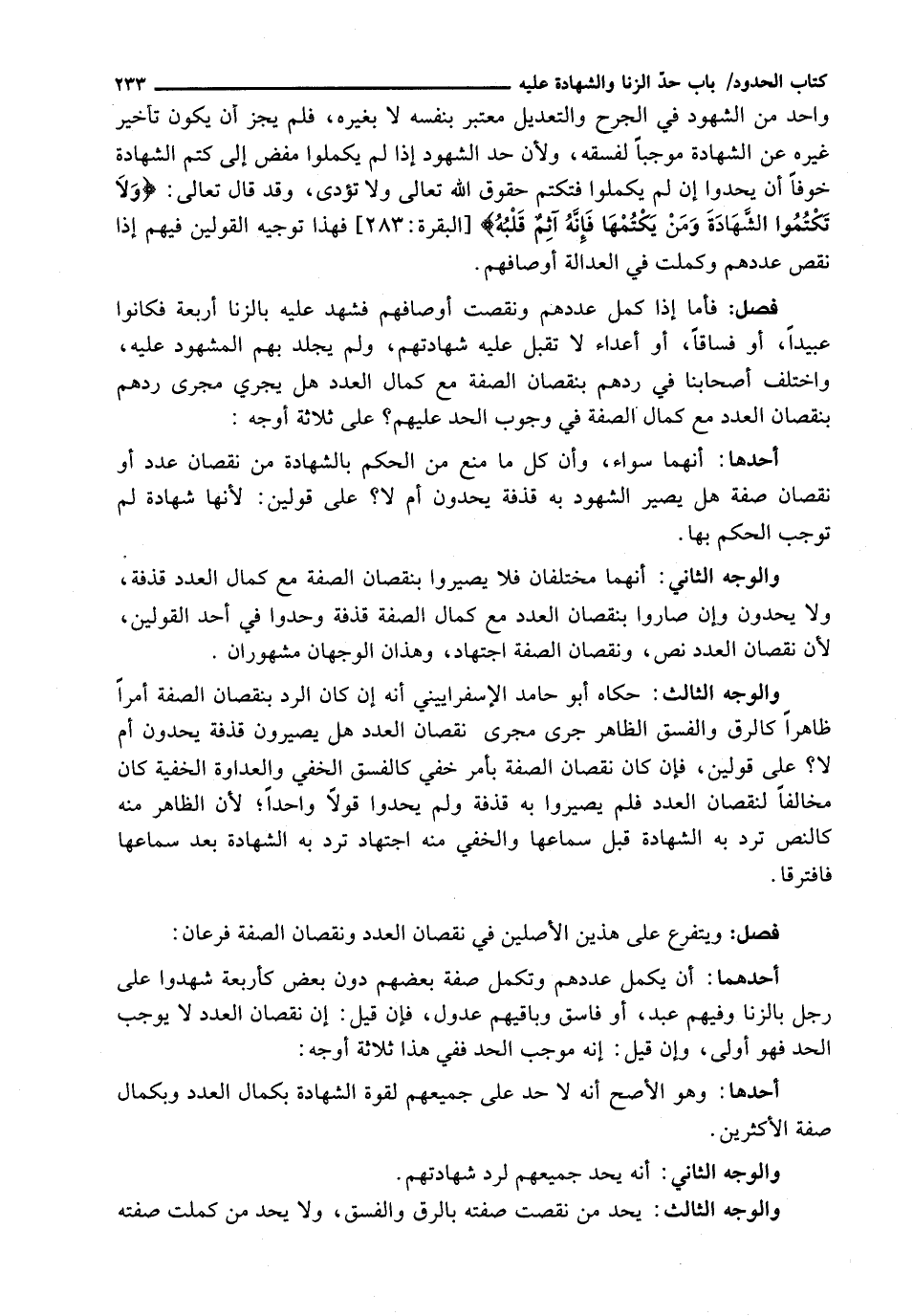 وَاحِدٍ مِنَ الشُّهُودِ فِي الْجَرْحِ وَالتَّعْدِيلِ مُعْتَبَرٌ بِنَفْسِهِ لَا بِغَيْرِهِ، فَلَمْ يَجُزْ أَنْ يَكُونَ تَأْخِيرُ غَيْرِهِ عَنِ الشَّهَادَةِ مُوجِبًا لِفِسْقِهِ، وَلِأَنَّ حَدَّ الشُّهُودِ إِذَا لَمْ يَكْمُلُوا مُفْضٍ إِلَى كَتْمِ الشَّهَادَةِ خَوْفًا أَنْ يُحُدُّوا إِنْ لَمْ يكملوا فتكتم حقوق الله تعالى ولا تؤدى، وَقَدْ قَالَ تَعَالَى: {وَلا تَكْتُمُوا الشَّهَادَةِ وَمَنْ يَكْتُمْهَا فَإِنَّهُ آثِمٌ قَلْبُهُ} [البقرة: 283] فَهَذَا تَوْجِيهُ الْقَوْلَيْنِ فِيهِمْ إِذَا نَقَصَ عَدَدُهُمْ وَكَمُلَتْ فِي الْعَدَالَةِ أَوْصَافُهُمْ.