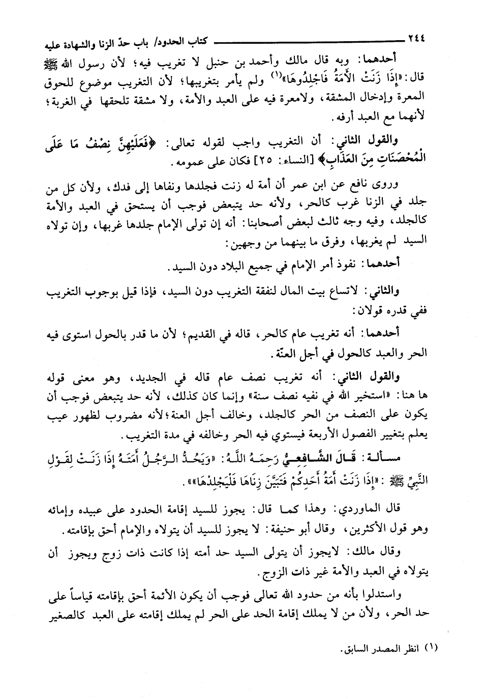 أَحَدُهُمَا: وَبِهِ قَالَ مَالِكٌ وَأَحْمَدُ بْنُ حَنْبَلٍ لَا تَغْرِيبَ فِيهِ؛ لِأَنَّ رَسُولَ اللَّهِ - صَلَّى اللَّهُ عَلَيْهِ وَسَلَّم َ - قَالَ: " إِذَا زَنَتِ الْأَمَةُ فَاجْلِدُوهَا) وَلَمْ يَأْمُرْ بتغريبها، لأن التَّغْرِيبَ مَوْضُوعٌ لِلُحُوقِ الْمَعَرَّةِ وَإِدْخَالِ الْمَشَقَّةِ، وَلَا مَعَرَّةَ فِيهِ عَلَى الْعَبْدِ وَالْأَمَةِ، وَلَا مَشَقَّةَ تلحقها في الغربة؛ لأنهما مع العبد أرفه.
