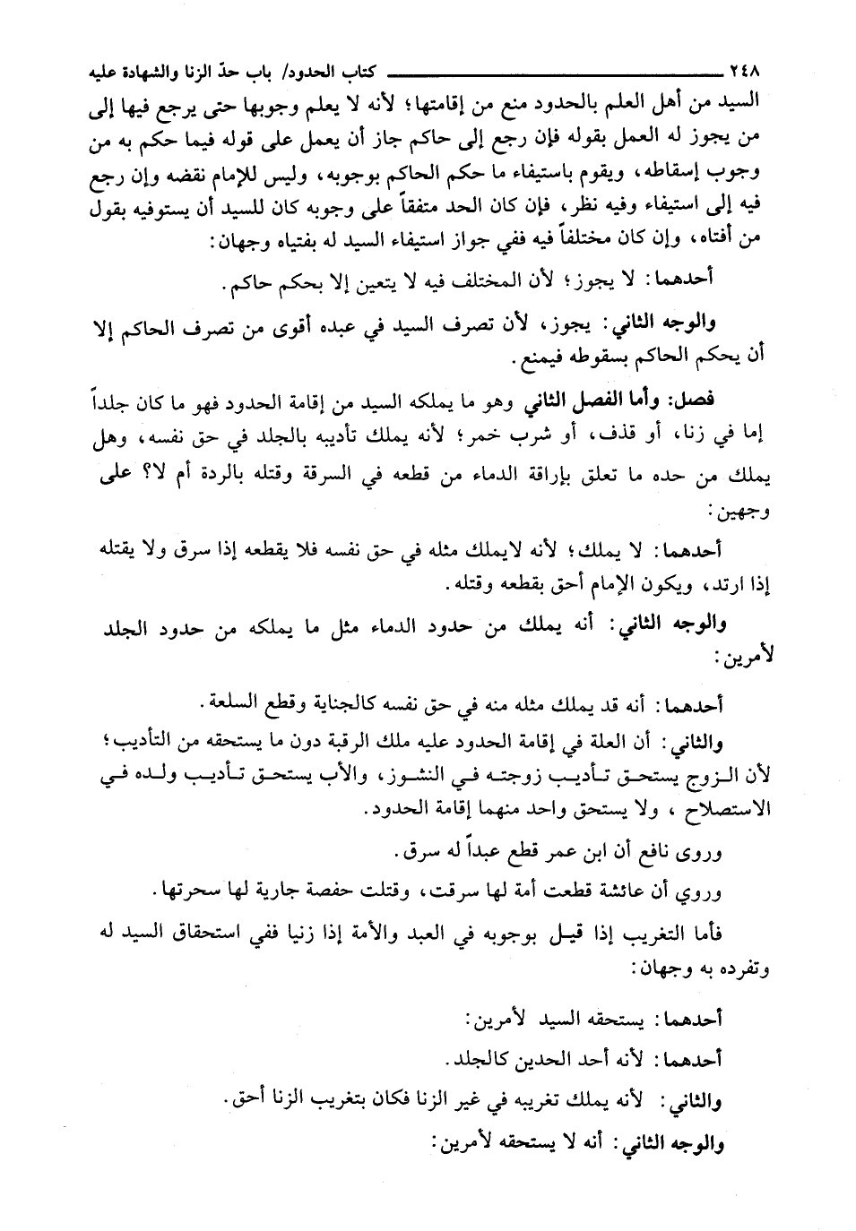 وَأَمَّا الْفَصْلُ الثَّانِي وَهُوَ مَا يَمْلِكُهُ السَّيِّدُ مِنْ إِقَامَةِ الْحُدُودِ فهو ما كان جلداً إما في زِنًا، أَوْ قَذْفٍ، أَوْ شُرْبِ خَمْرٍ، لِأَنَّهُ يَمْلِكُ تَأْدِيبَهُ بِالْجَلْدِ فِي حَقِّ نَفْسِهِ، وَهَلْ يَمْلِكُ مِنْ حَدِّهِ مَا تَعَلَّقَ بِإِرَاقَةِ الدِّمَاءِ مِنْ قَطْعِهِ فِي السَّرِقَةِ وَقَتْلِهِ بِالرِّدَّةِ أَمْ لا؟ على وجهين: