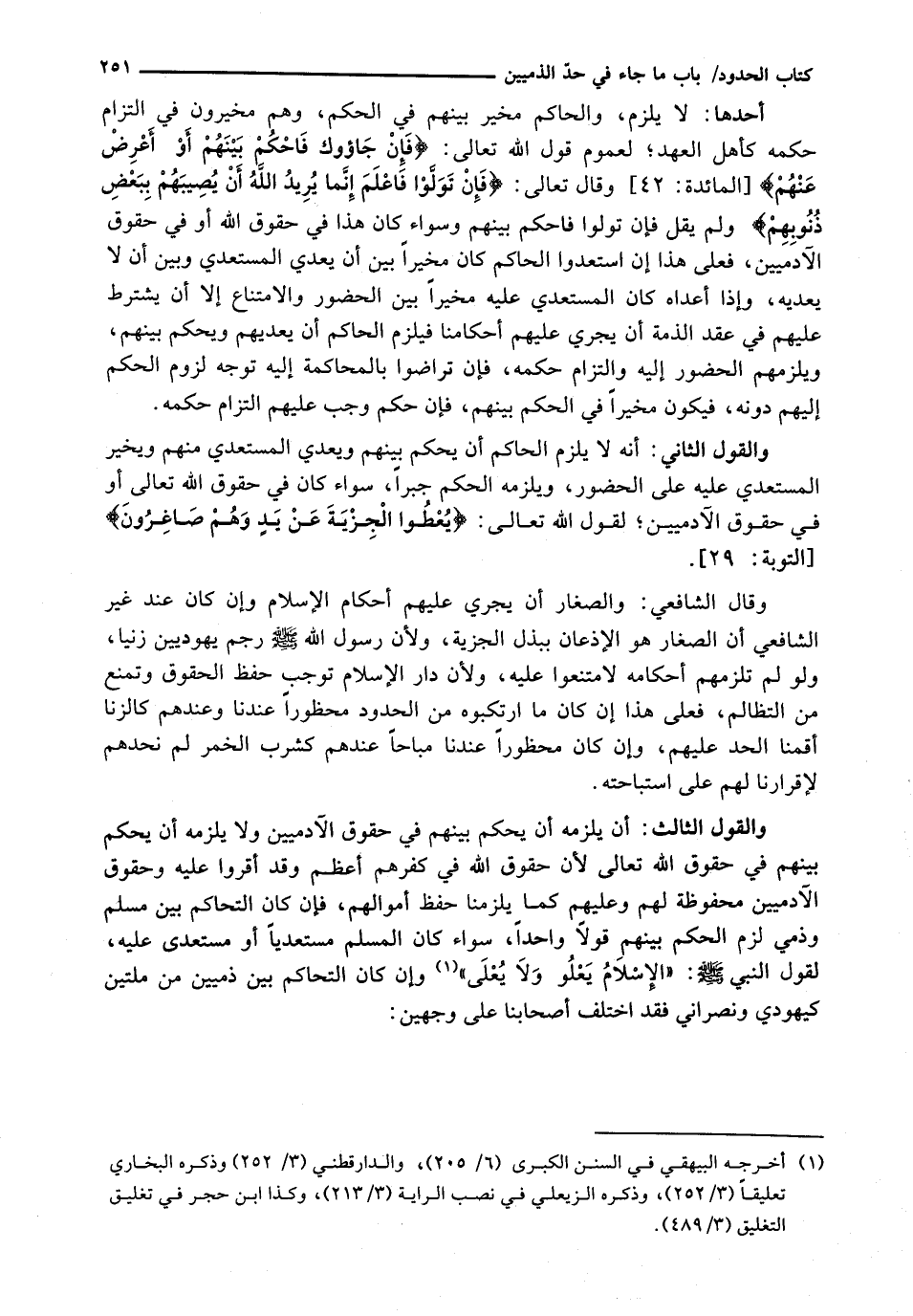 وَالْقَوْلُ الثَّالِثُ: أن يَلْزَمَهُ أَنْ يَحْكُمَ بَيْنَهُمْ فِي حُقُوقِ الْآدَمِيِّينَ وَلَا يَلْزَمَهُ أَنْ يَحْكُمَ بَيْنَهُمْ فِي حُقُوقِ الله تعالى لأن حقوق اللَّهِ فِي كُفْرِهِمْ أَعْظَمُ وَقَدْ أُقِرُّوا عَلَيْهِ وَحُقُوقَ الْآدَمِيِّينَ مَحْفُوظَةٌ لَهُمْ وَعَلَيْهِمْ كَمَا يَلْزَمُنَا حِفْظُ أَمْوَالِهِمْ، فَإِنْ كَانَ التَّحَاكُمُ بَيْنَ مُسْلِمٍ وَذِمِّيٍّ لَزِمَ الْحُكْمُ بَيْنَهُمِ قَوْلًا وَاحِدًا، سَوَاءٌ كَانَ الْمُسْلِمُ مُسْتَعْدِيًا أَوْ مُسْتَعْدًى عَلَيْهِ، لِقَوْلِ النَّبِيِّ - صَلَّى اللَّهُ عَلَيْهِ وَسَلَّم َ -: " الْإِسْلَامُ يَعْلُو وَلَا يُعْلَى) وَإِنْ كَانَ التَّحَاكُمُ بَيْنَ ذِمِّيِّينَ مِنْ مِلَّتَيْنِ كَيَهُودِيٍّ وَنَصْرَانِيٍّ فَقَدِ اخْتَلَفَ أَصْحَابُنَا عَلَى وَجْهَيْنِ:
