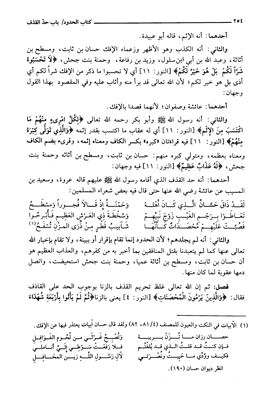 أَحَدُهُمَا: أَنَّهُ حَدُّ الْقَذْفِ الَّذِي أَقَامَهُ رَسُولُ اللَّهِ - صَلَّى اللَّهُ عَلَيْهِ وَسَلَّم َ - عَلَيْهِمْ قَالَهُ عُرْوَةُ، وَسَعِيدُ بْنُ الْمُسَيَّبِ عَنْ عائشة رضي الله عنها حتى قال فيه بَعْضُ شُعَرَاءِ الْمُسْلِمِينَ: