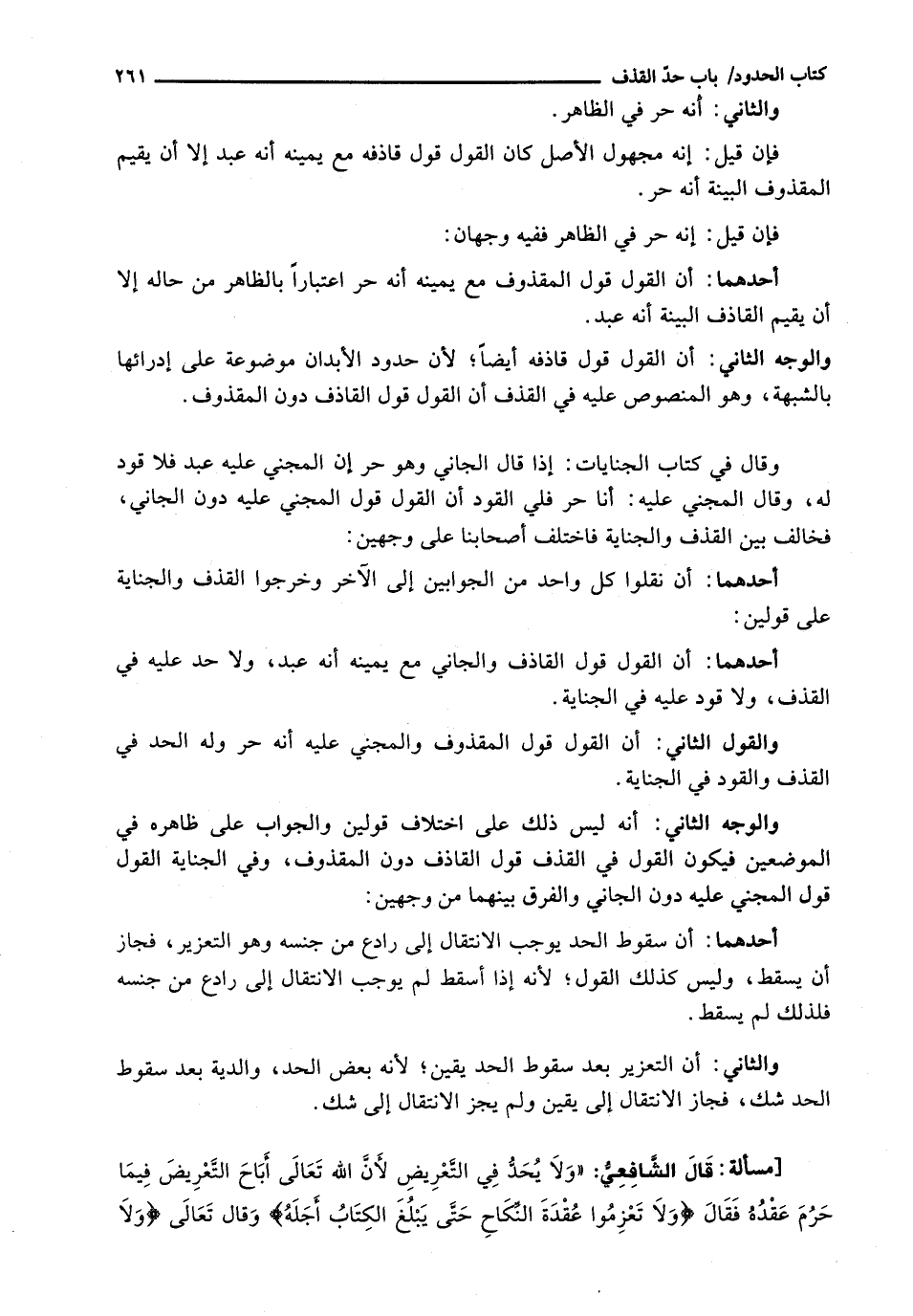 قال الشافعي: " ولا يحد في التعريض لأن الله تعالى أباح التعريض فيما حرم عقده فقال {وَلا تَعْزِمُوا عُقْدَةَ النِّكَاحِ حَتَّى يَبْلُغَ الْكِتَابُ أجله} وقال تعالى {ولا