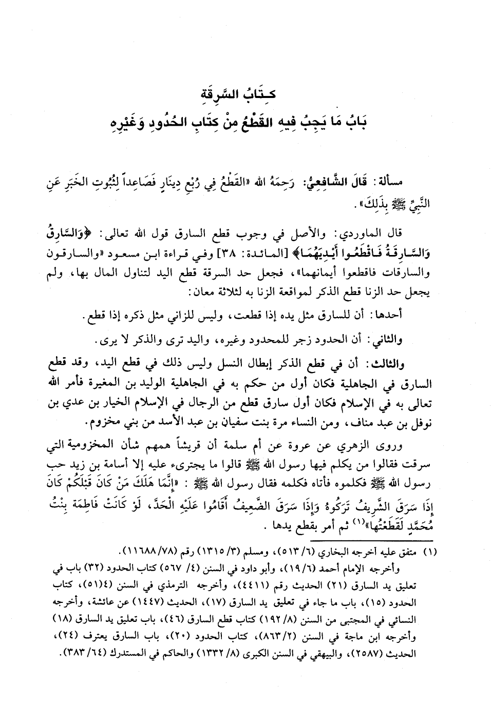 قَالَ الشَّافِعِيُّ: رَحِمَهُ اللَّهُ " الْقَطْعُ فِي رُبُعِ دِينَارٍ فَصَاعِدًا لِثُبُوتِ الْخَبَرِ عَنِ النَّبِيِّ - صَلَّى اللَّهُ عَلَيْهِ وَسَلَّم َ - بذلك) .