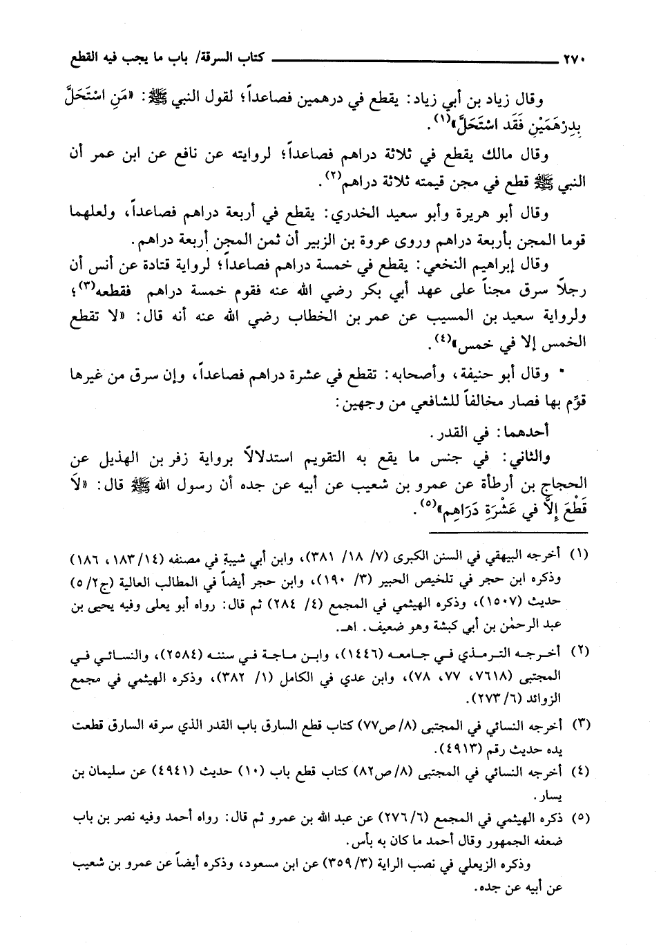 وَقَالَ إِبْرَاهِيمُ النَّخَعِيُّ: يُقْطَعُ فِي خَمْسَةِ دَرَاهِمَ فَصَاعِدًا؛ لِرِوَايَةِ قَتَادَةَ عَنْ أَنَسٍ أَنَّ رَجُلًا سَرَقَ مِجَنًّا عَلَى عَهْدِ أَبِي بَكْرٍ رَضِيَ اللَّهُ عَنْهُ فَقُوِّمَ خَمْسَةَ دَرَاهِمَ فَقَطَعَهُ؛ وَلِرِوَايَةِ سَعِيدِ بْنِ الْمُسَيَّبِ عَنْ عُمَرَ بْنِ الْخَطَّابِ رَضِيَ اللَّهُ عَنْهُ أَنَّهُ قَالَ: " لَا تُقْطَعُ الْخَمْسُ إِلَّا في خمس) .