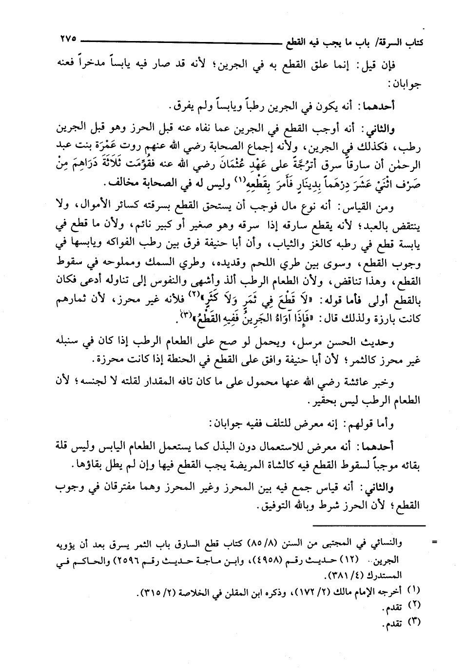 وَالثَّانِي: أَنَّهُ أَوْجَبَ الْقَطْعَ فِي الْجَرِينِ عَمَّا نَفَاهُ عَنْهُ قَبْلَ الْحِرْزِ وَهُوَ قَبْلَ الْجَرِينِ رَطْبٌ، فَكَذَلِكَ فِي الْجَرِينِ، وَلِأَنَّهُ إِجْمَاعُ الصَّحَابَةِ رَضِيَ اللَّهُ عَنْهُمْ رَوَتْ عَمْرَةُ بِنْتُ عَبْدِ الرَّحْمَنِ أَنَّ سَارِقًا سرق أترجة على عهد عثمان رضي الله عنه فَقُوِّمَتْ ثَلَاثَةَ دَرَاهِمَ مِنْ صَرْفِ اثْنَيْ عَشَرَ دِرْهَمًا بِدِينَارٍ فَأَمَرَ بِقَطْعِهِ وَلَيْسَ لَهُ فِي الصَّحَابَةِ مُخَالِفٌ. وَمِنَ الْقِيَاسِ: أَنَّهُ نَوْعُ مَالٍ فَوَجَبَ أَنْ يَسْتَحِقَّ الْقَطْعَ بِسَرِقَتِهِ كَسَائِرِ الْأَمْوَالِ، وَلَا يُنْتَقَضُ بِالْعَبْدِ؛ لِأَنَّهُ يُقْطَعُ سَارِقُهُ إِذَا سَرَقَهُ وَهُوَ صَغِيرٌ أَوْ كَبِيرٌ نَائِمٌ، وَلِأَنَّ مَا قُطِعَ فِي يَابِسَةٍ قُطِعَ فِي رُطَبِهِ كالغز والثياب، وأن أَبَا حَنِيفَةَ فَرَّقَ بَيْنَ رُطَبِ الْفَوَاكِهِ وَيَابِسِهَا فِي وُجُوبِ الْقَطْعِ، وَسَوَّى بَيْنَ طَرِيِّ اللَّحْمِ وَقَدِيدِهِ، وَطَرِيِّ السَّمَكِ وَمَمْلُوحِهِ فِي سُقُوطِ الْقَطْعِ، وَهَذَا تَنَاقُضٌ، وَلِأَنَّ الطَّعَامَ الرَّطْبَ أَلَذُّ وَأَشْهَى وَالنُّفُوسَ إِلَى تَنَاوُلِهِ أَدْعَى فَكَانَ بِالْقَطْعِ أَوْلَى فَأَمَّا قَوْلُهُ: " لَا قَطْعَ فِي ثَمَرٍ وَلَا كَثَرٍ) فَلِأَنَّهُ غَيْرُ مُحْرَزٍ، لِأَنَّ ثِمَارَهُمْ كَانَتْ بَارِزَةً وَلِذَلِكَ قَالَ: " فَإِذَا آوَاهُ الْجَرِينُ فَفِيهِ الْقَطْعُ) .
