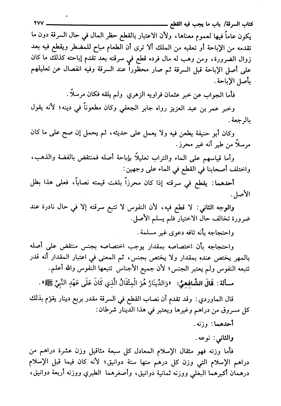 قال الماوردي: وقد تَقَدَّمَ أَنَّ نِصَابَ الْقَطْعِ فِي السَّرِقَةِ مُقَدَّرٌ بربع دينار يقوم بذلك كل مسروق من دراهم وَغَيْرِهَا وَيُعْتَبَرُ فِي هَذَا الدِّينَارُ شَرْطَانِ: