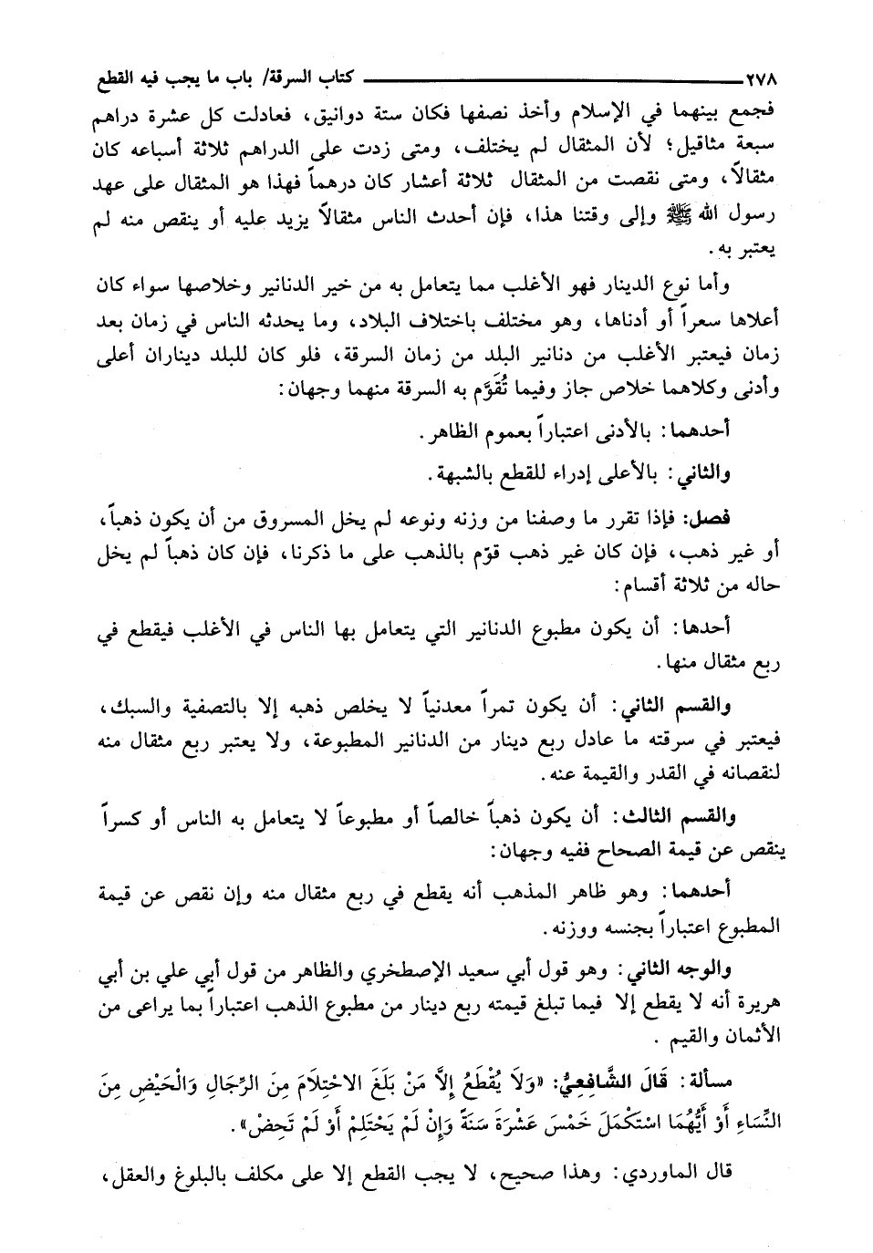 وَالْقِسْمُ الثاني: أن يكون تمراً مَعْدِنِيًّا لَا يَخْلُصُ ذَهَبُهُ إِلَّا بِالتَّصْفِيَةِ وَالسَّبْكِ، فَيُعْتَبَرُ فِي سَرِقَتِهِ مَا عَادَلَ رُبُعَ دِينَارٍ مِنَ الدَّنَانِيرِ الْمَطْبُوعَةِ، وَلَا يُعْتَبَرُ رُبُعُ مِثْقَالٍ مِنْهُ لِنُقْصَانِهِ فِي الْقَدْرِ وَالْقِيمَةِ عَنْهُ.