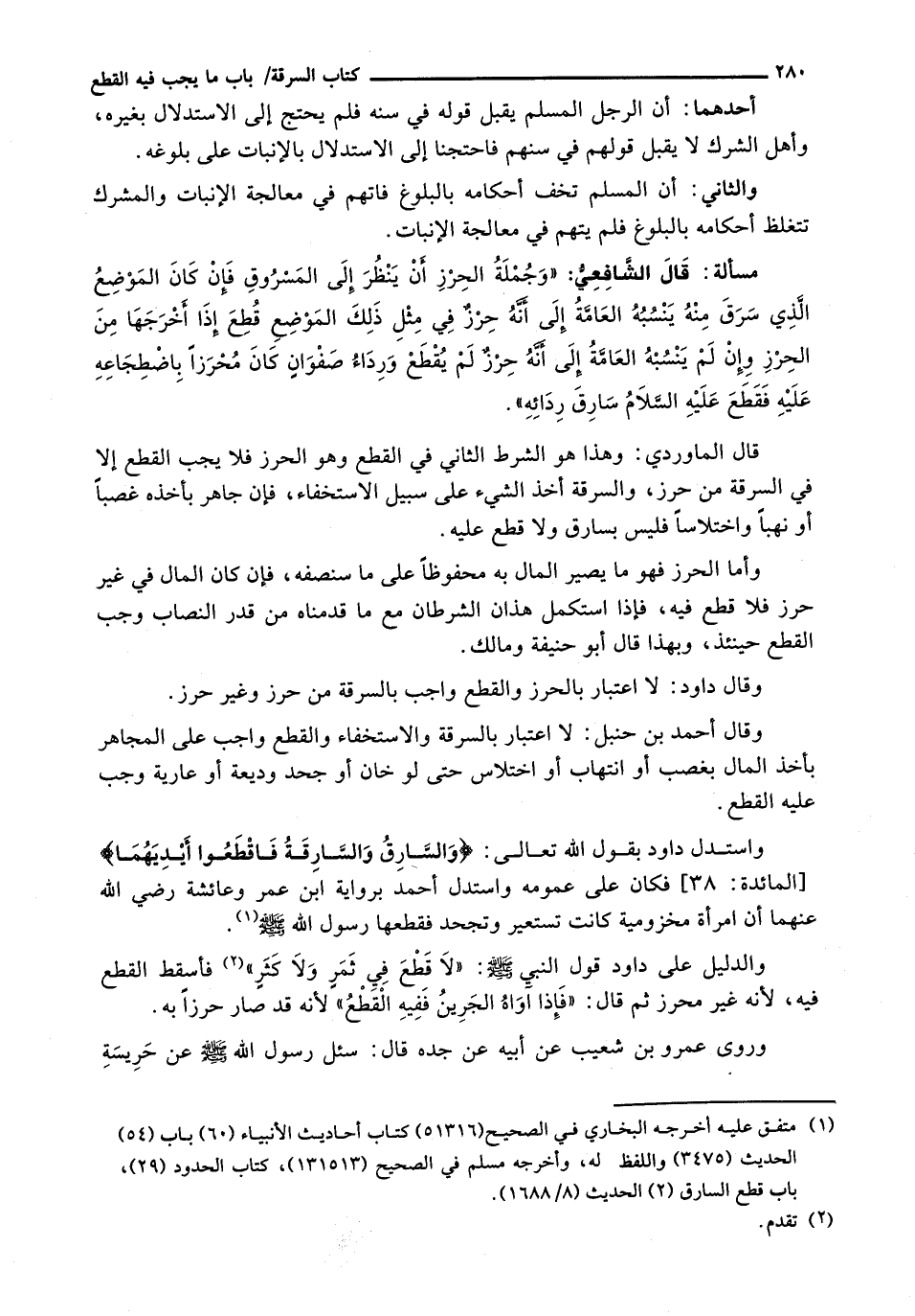وَأَمَّا الْحِرْزُ فَهُوَ مَا يَصِيرُ الْمَالُ بِهِ مَحْفُوظًا عَلَى مَا سَنَصِفُهُ، فَإِنْ كَانَ الْمَالُ فِي غَيْرِ حِرْزٍ فَلَا قَطْعَ فِيهِ، فَإِذَا اسْتَكْمَلَ هَذَانِ الشَّرْطَانِ مَعَ مَا قَدَّمْنَاهُ مِنْ قَدْرِ النِّصَابِ وَجَبَ الْقَطْعُ حِينَئِذٍ، وَبِهَذَا قَالَ أَبُو حَنِيفَةَ وَمَالِكٌ.