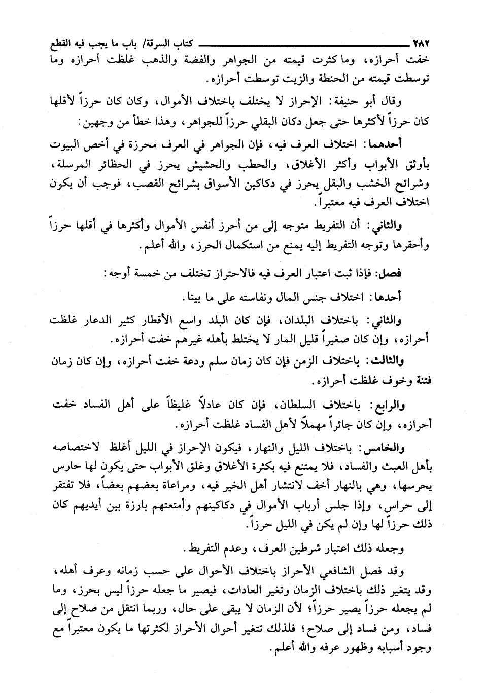 وَقَدْ فَصَّلَ الشَّافِعِيُّ الْأَحْرَازَ بِاخْتِلَافِ الْأَحْوَالِ عَلَى حَسَبِ زَمَانِهِ وَعُرْفِ أَهْلِهِ، وَقَدْ يَتَغَيَّرُ ذَلِكَ بِاخْتِلَافِ الزَّمَانِ وَتَغَيُّرِ الْعَادَاتِ، فَيَصِيرُ مَا جَعَلَهُ حِرْزًا لَيْسَ بِحِرْزٍ، وَمَا لَمْ يَجْعَلْهُ حِرْزًا يَصِيرُ حِرْزًا؛ لِأَنَّ الزَّمَانَ لَا يَبْقَى عَلَى حَالٍ، وربما انتقل من صلاح إلى فساد، ومن فساد إلى صلاح؛ فلذلك تتغير أحوال الأحراز لكثرتها ما يَكُونَ مُعْتَبَرًا مَعَ وُجُودِ أَسْبَابِهِ وَظُهُورِ عُرْفِهِ والله أعلم.