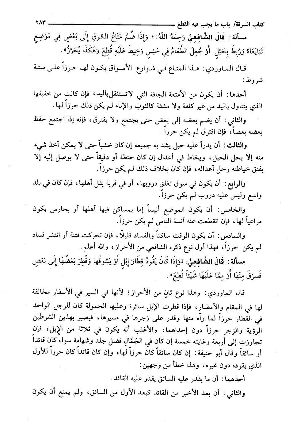 قَالَ الْمَاوَرْدِيُّ: وَهَذَا نَوْعٌ ثَانٍ مِنَ الْأَحْرَازِ، لِأَنَّهَا فِي السَّيْرِ فِي الْأَسْفَارِ مُخَالِفَةٌ لَهَا فِي الْمُقَامِ وَالْأَمْصَارِ، فَإِذَا قُطِرَتِ الْإِبِلُ سَائِرَةً وَعَلَيْهَا الْحُمُولَةُ كَانَ لِلرَّجُلِ الْوَاحِدِ فِي الْقِطَارِ حِرْزًا لِمَا رَآهُ مِنْهَا وَقَدَرَ عَلَى زَجْرِهَا فِي مَسِيرِهَا، فَيَصِيرُ بِهَذَيْنِ الشَّرْطَيْنِ الرُّؤْيَةِ والزجر حرزاً دون إحداهما، وَالْأَغْلَبُ أَنَّهُ يَكُونُ فِي ثَلَاثَةٍ مِنَ الْإِبِلِ، فإن تجاوزت إلى أَرْبَعَةٍ وَغَايَتُهُ خَمْسَةٌ إِنْ كَانَ فِي الْجَمَالِ فضل جلد وشهامة سواء كان قائداً أو سائقا وَقَالَ أَبُو حَنِيفَةَ: إِنْ كَانَ سَائِقًا كَانَ حِرْزًا لَهَا، وَإِنْ كَانَ قَائِدًا كَانَ حِرْزًا لِلْأَوَّلِ الَّذِي يَقُودُهُ دُونَ غَيْرِهِ، وَهَذَا خَطَأٌ مِنْ وَجْهَيْنِ: