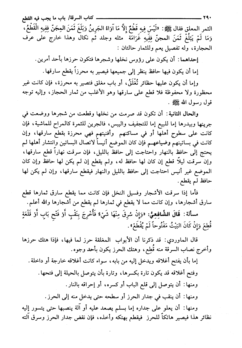 وَإِمَّا أَنْ يَكُونَ عَلَيْهَا حَظَائِرُ تُغْلَقُ، أَوْ باب مغلق فَتَصِيرُ بِهِ مُحْرَزَةً، فَإِنْ كَانَتْ غَيْرَ مَحْظُورَةٍ وَلَا مَحْفُوظَةٍ فَلَا قَطْعَ عَلَى سَارِقِهَا وَهُوَ الأغلب من ثمار الحجاز، وإليه توجه قَوْلُ رَسُولِ اللَّهِ - صَلَّى اللَّهُ عَلَيْهِ وَسَلَّم َ -.