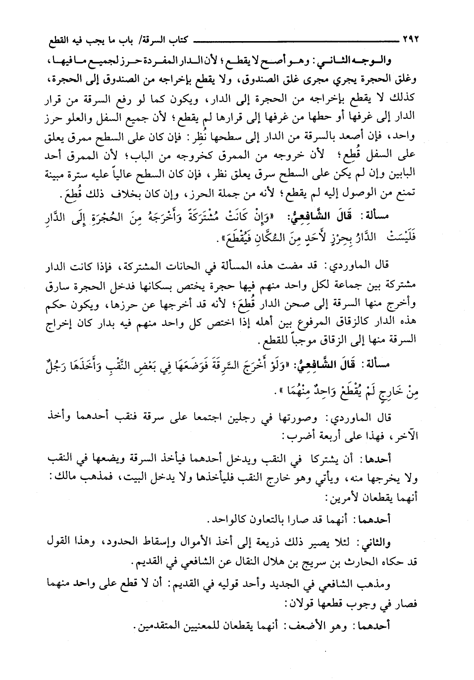قَالَ الْمَاوَرْدِيُّ: قَدْ مَضَتْ هَذِهِ الْمَسْأَلَةُ فِي الْحَانَاتِ الْمُشْتَرَكَةِ، فَإِذَا كَانَتِ الدَّارُ مُشْتَرِكَةً بَيْنَ جَمَاعَةٍ لِكُلِّ وَاحِدٍ مِنْهُمْ فِيهَا حُجْرَةٌ يَخْتَصُّ بِسُكَّانِهَا فَدَخَلَ الْحُجْرَةَ سَارِقٌ وَأَخْرَجَ مِنْهَا السَّرِقَةَ إِلَى صَحْنِ الدَّارِ قُطِعَ؛ لِأَنَّهُ قَدْ أَخْرَجَهَا عَنْ حِرْزِهَا، وَيَكُونُ حُكْمُ هَذِهِ الدَّارِ كَالزُّقَاقِ الْمَرْفُوعِ بَيْنَ أَهْلِهِ إِذَا اخْتَصَّ كُلُّ وَاحِدٍ مِنْهُمْ فِيهِ بِدَارٍ كَانَ إِخْرَاجُ السَّرِقَةِ مِنْهَا إلى الزقاق موجباً للقطع.