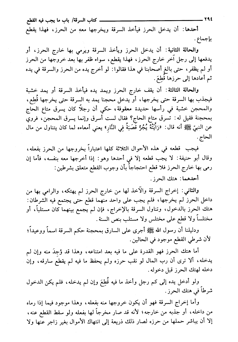 والحالة الثَّالِثَةُ: أَنْ يَقِفَ خَارِجَ الْحِرْزِ وَيَمُدَّ يَدَهُ فَيَأْخُذَ السَّرِقَةَ أَوْ يَمُدَّ خَشَبَةً فَيَجْذِبَ بِهَا السَّرِقَةَ حَتَّى يُخْرِجَهَا، أَوْ يُدْخِلَ مِحْجَنًا يَمُدُّ بِهِ السَّرِقَةَ حَتَّى يُخْرِجَهَا قُطِعَ، وَالْمِحْجَنُ خَشَبَةٌ فِي رَأْسِهَا حَدِيدَةٌ مَعْقُوفَةٌ، حُكِيَ أَنَّ رَجُلًا كان يسرق متاع الحاج بمحجنة فَقِيلَ لَهُ: تَسْرِقُ مَتَاعَ الْحَاجِّ؟ فَقَالَ لَسْتُ أَسْرِقُ وَإِنَّمَا يَسْرِقُ الْمِحْجَنُ، فَرُوِيَ عَنِ النَّبِيِّ - صَلَّى اللَّهُ عَلَيْهِ وَسَلَّم َ - أَنَّهُ قَالَ: " رَأَيْتُهُ يُجُرُّ قُصْبَهُ فِي النَّارِ) يَعْنِي أَمْعَاءَهُ لِمَا كَانَ يَتَنَاوَلُ مِنْ مَالِ الْحَاجِّ.
