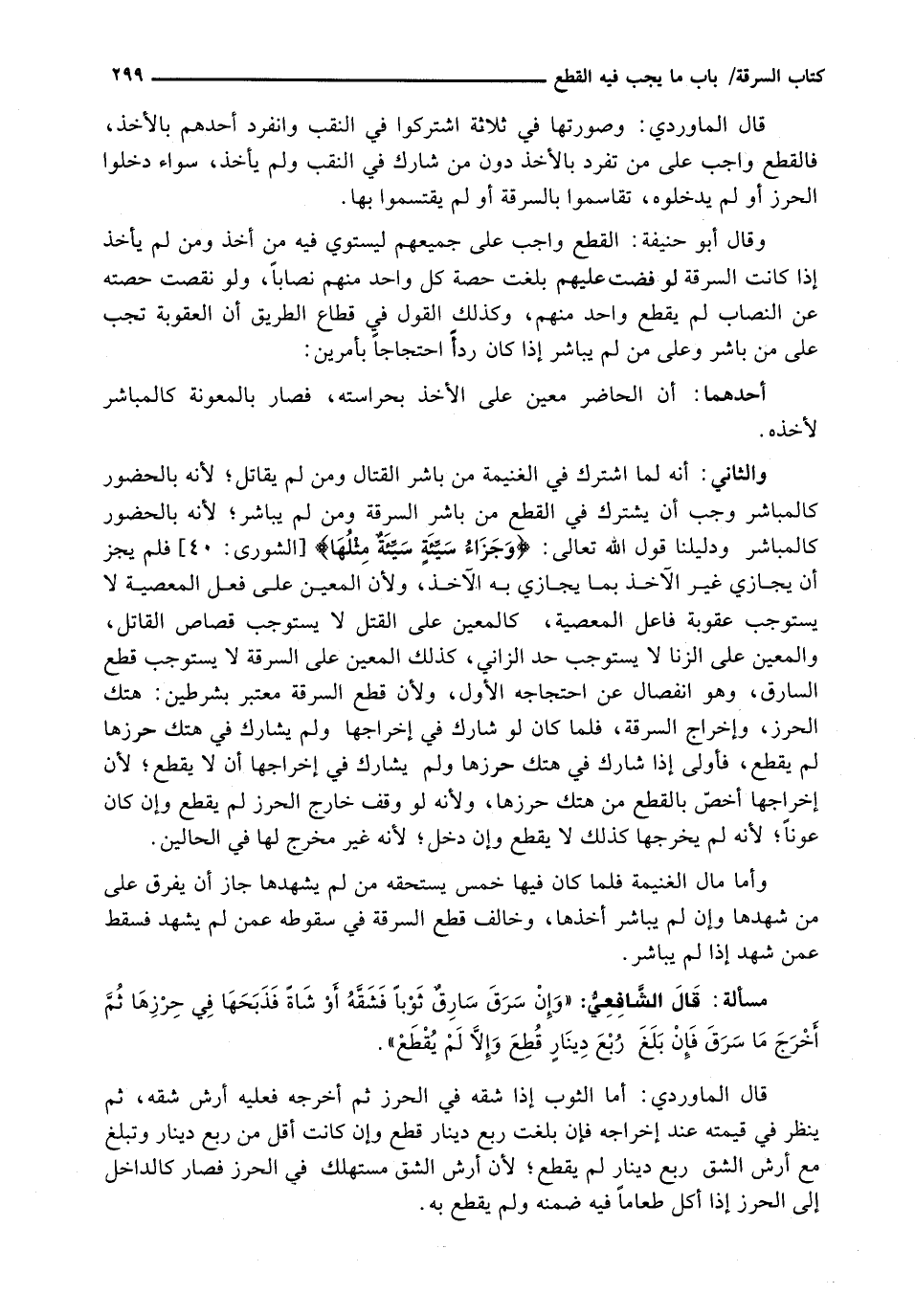 وَالثَّانِي: أَنَّهُ لَمَّا اشْتَرَكَ فِي الْغَنِيمَةِ مَنْ بَاشَرَ الْقِتَالَ وَمَنْ لَمْ يُقَاتِلْ؛ لِأَنَّهُ بِالْحُضُورِ كَالْمُبَاشِرِ وَجَبَ أَنْ يَشْتَرِكَ فِي الْقَطْعِ مَنْ بَاشَرَ السَّرِقَةَ وَمَنْ لَمْ يُبَاشِرْ؛ لِأَنَّهُ بِالْحُضُورِ كَالْمُبَاشِرِ وَدَلِيلُنَا قَوْلُ اللَّهِ تَعَالَى: {وَجَزَاءُ سَيِّئَةٍ سَيِّئَةٌ مِثْلُهَا} [الشورى: 40] فَلَمْ يَجُزْ أَنْ يُجَازَى غَيْرُ الْآخِذِ بِمَا يُجَازَى بِهِ الْآخِذُ، وَلِأَنَّ الْمُعِينَ عَلَى فِعْلِ الْمَعْصِيَةِ لَا يَسْتَوْجِبُ عُقُوبَةَ فَاعِلِ الْمَعْصِيَةِ، كَالْمُعِينِ عَلَى الْقَتْلِ لَا يَسْتَوْجِبُ قِصَاصَ الْقَاتِلِ، وَالْمُعِينُ عَلَى الزِّنَا لَا يَسْتَوْجِبُ حَدَّ الزَّانِي، كَذَلِكَ الْمُعِينُ عَلَى السَّرِقَةِ لَا يَسْتَوْجِبُ قَطْعَ السَّارِقِ، وَهُوَ انْفِصَالٌ عَنِ احْتِجَاجِهِ الْأَوَّلِ، وَلِأَنَّ قَطْعَ السَّرِقَةِ مُعْتَبَرٌ بِشَرْطَيْنِ: هَتْكُ الْحِرْزِ، وَإِخْرَاجُ السَّرِقَةِ، فَلَمَّا كَانَ لَوْ شَارَكَ فِي إِخْرَاجِهَا وَلَمْ يُشَارِكْ فِي هَتْكِ حِرْزِهَا لَمْ يُقْطَعْ، فَأَوْلَى إِذَا شَارَكَ فِي هَتْكِ حِرْزِهَا وَلَمْ يُشَارِكْ فِي إِخْرَاجِهَا أَنْ لَا يُقْطَعَ؛ لِأَنَّ إِخْرَاجَهَا أَخَصُّ بِالْقَطْعِ مِنْ هَتْكِ حِرْزِهَا، وَلِأَنَّهُ لَوْ وَقَفَ خَارِجَ الْحِرْزِ لَمْ يُقْطَعْ وَإِنْ كَانَ عَوْنًا؛ لِأَنَّهُ لَمْ يُخْرِجْهَا كَذَلِكَ لَا يُقْطَعُ وَإِنْ دَخَلَ؛ لِأَنَّهُ غَيْرُ مُخْرِجٍ لَهَا فِي الْحَالَيْنِ.