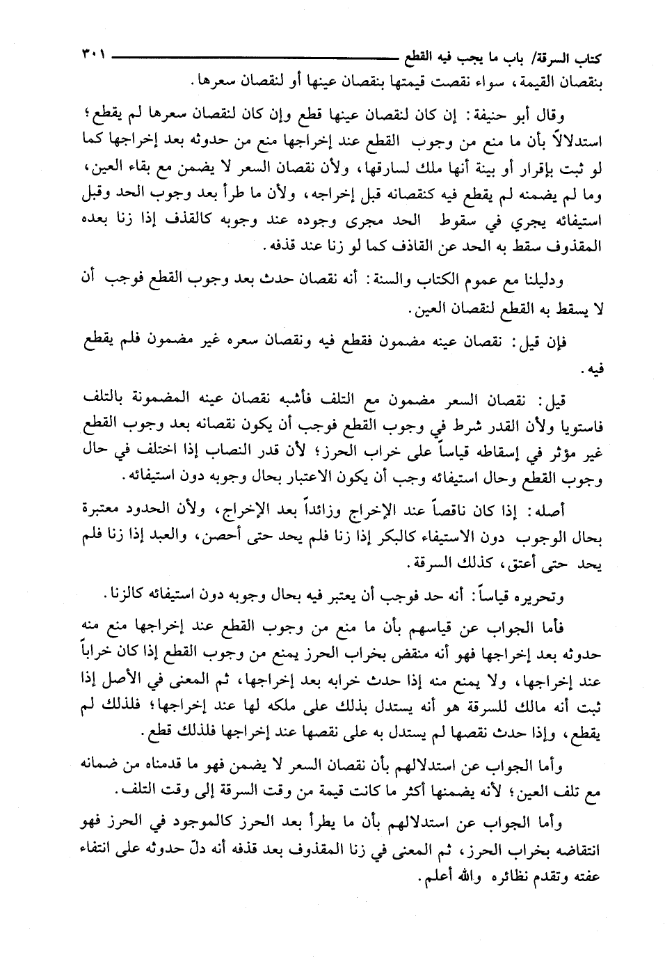 فَأَمَّا الْجَوَابُ عَنْ قِيَاسِهِمْ بِأَنَّ مَا مَنَعَ مِنْ وُجُوبِ القطع عند إخراجها منع منه حدوثه بعد إخراجها فهو أنه منقض بِخَرَابِ الْحِرْزِ يَمْنَعُ مِنْ وُجُوبِ الْقَطْعِ إِذَا كَانَ خَرَابًا عِنْدَ إِخْرَاجِهَا، وَلَا يَمْنَعُ مِنْهُ إِذَا حَدَثَ خَرَابُهُ بَعْدَ إِخْرَاجِهَا، ثُمَّ الْمَعْنَى فِي الْأَصْلِ إِذَا ثَبَتَ أَنَّهُ مَالِكٌ لِلسَّرِقَةِ هو أن يُسْتَدَلُّ بِذَلِكَ عَلَى مِلْكِهِ لَهَا عِنْدَ إِخْرَاجِهَا؛ فَلِذَلِكَ لَمْ يُقْطَعْ، وَإِذَا حَدَثَ نَقْصُهَا لَمْ يُسْتَدَلَّ بِهِ عَلَى نَقْصِهَا عِنْدَ إِخْرَاجِهَا فَلِذَلِكَ قُطِعَ.