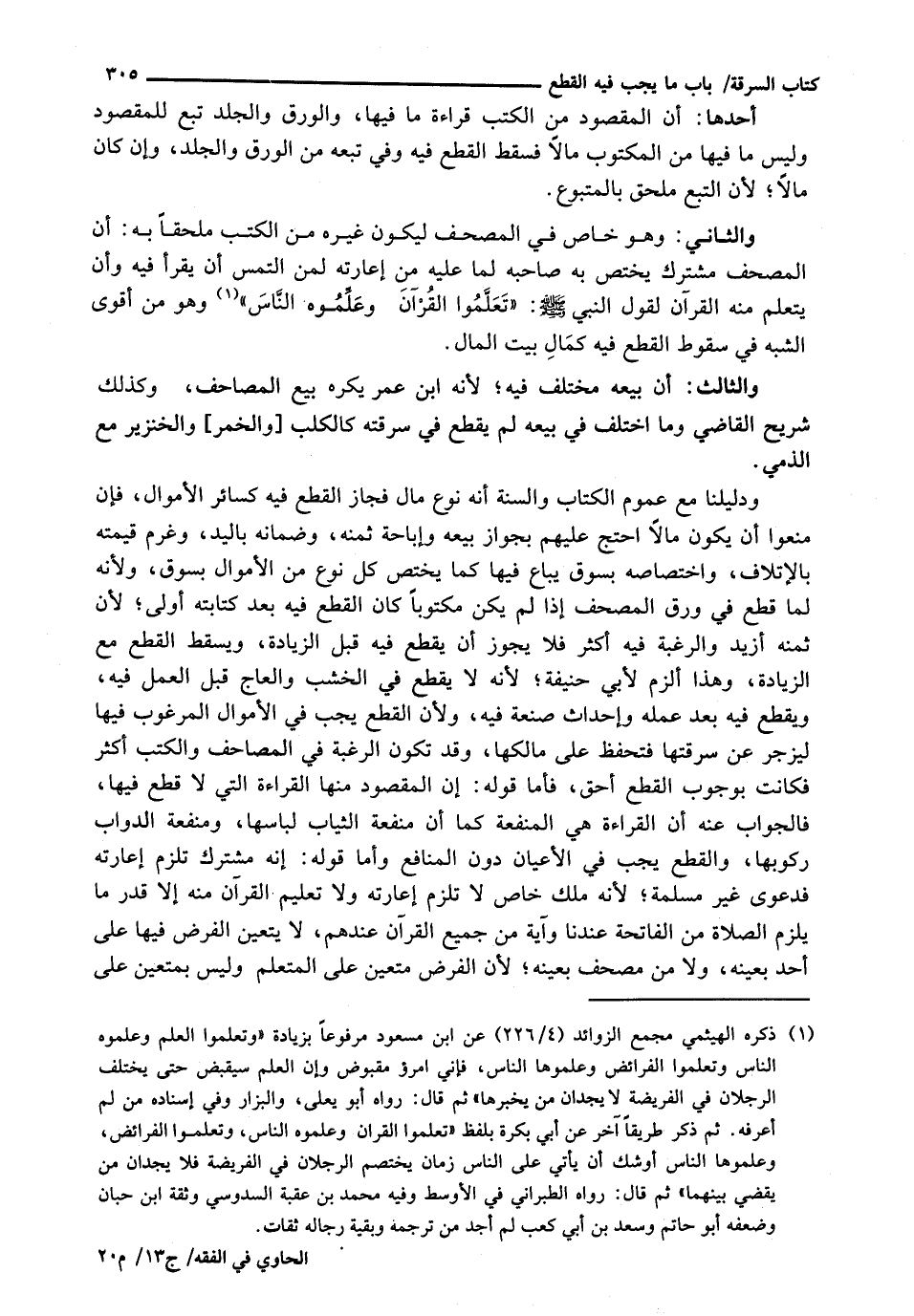 وَالثَّانِي: وَهُوَ خَاصٌّ فِي الْمُصْحَفِ لِيَكُونَ غَيْرُهُ مِنَ الْكُتُبِ ملحقاً به: أن المصحف مشترك يَخْتَصُّ بِهِ صَاحِبُهُ لِمَا عَلَيْهِ مِنْ إِعَارَتِهِ لمن التمس أن يقرأ فِيهِ وَأَنْ يَتَعَلَّمَ مِنْهُ الْقُرْآنَ لِقَوْلِ النَّبِيِّ - صَلَّى اللَّهُ عَلَيْهِ وَسَلَّم َ - " تَعَلَّمُوا الْقُرْآنَ وَعَلِّمُوهُ النَّاسَ) وَهُوَ مِنْ أَقْوَى الشُّبَهِ فِي سُقُوطِ الْقَطْعِ فِيهِ كَمَالِ بَيْتِ المال.