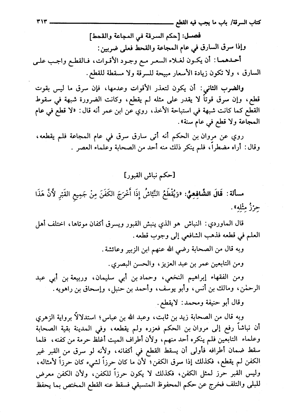 وَبِهِ قَالَ مِنَ الصَّحَابَةِ زَيْدُ بْنُ ثَابِتٍ، وَعَبْدُ اللَّهِ بْنُ عَبَّاسٍ؛ اسْتِدْلَالًا بِرِوَايَةِ الزُّهْرِيِّ أَنَّ نَبَّاشًا رُفِعَ إِلَى مَرْوَانَ بْنِ الْحَكَمِ فَعَزَّرَهُ وَلَمْ يَقْطَعْهُ، وَفِي الْمَدِينَةِ بَقِيَّةُ الصَّحَابَةِ وَعُلَمَاءُ التَّابِعِينَ فَلَمْ يُنْكِرْهُ أَحَدٌ مِنْهُمْ، وَلِأَنَّ أَطْرَافَ الْمَيِّتِ أَغْلَظُ حُرْمَةً مِنْ كَفَنِهِ، فَلَمَّا سَقَطَ ضَمَانُ أَطْرَافِهِ فَأَوْلَى أَنْ يَسْقُطَ الْقَطْعُ فِي أَكْفَانِهِ، وَلِأَنَّهُ لَوْ سَرَقَ مِنَ الْقَبْرِ غَيْرَ الْكَفَنِ لَمْ يُقْطَعْ، فَكَذَلِكَ إِذَا سَرَقَ الْكَفَنَ؛ لِأَنَّ مَا كَانَ حِرْزًا لشيء كان حرزاً لأمثاله، وليس القبر حرز لِمِثْلِ الْكَفَنِ، فَكَذَلِكَ لَا يَكُونُ حِرْزًا لِلْكَفَنِ، وَلِأَنَّ الْكَفَنَ مُعَرَّضٌ لِلْبِلَى وَالتَّلَفِ فَخَرَجَ عَنْ حُكْمِ الْمَحْفُوظِ الْمُسْتَبْقَى فَسَقَطَ عَنْهُ الْقَطْعُ الْمُخْتَصُّ بما يحفظ