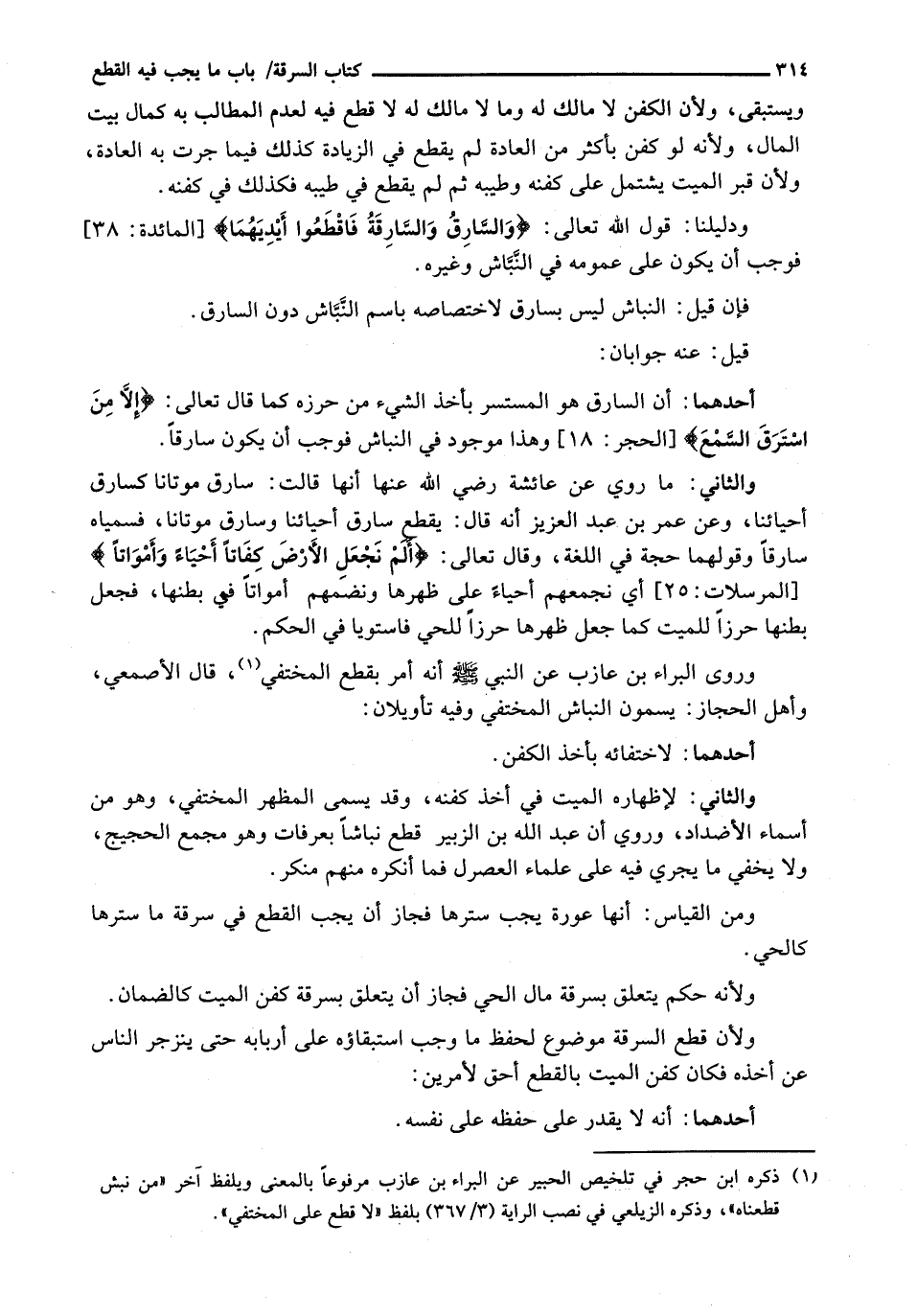 أحدهما: أن السارق هو المستسر بِأَخْذِ الشَّيْءِ مِنْ حِرْزِهِ كَمَا قَالَ تَعَالَى: {إِلا مَنِ اسْتَرَقَ السَّمْعَ} [الحجر: 18] وَهَذَا مَوْجُودٌ فِي النَّبَّاشِ فَوَجَبَ أَنْ يَكُونَ سَارِقًا.