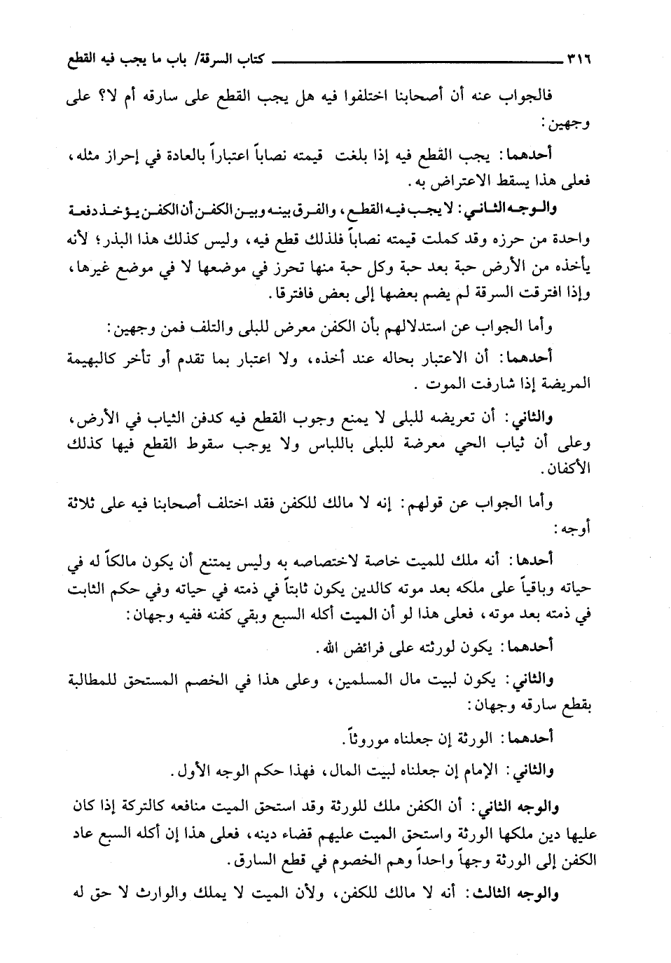 وَالْوَجْهُ الثَّانِي: أَنَّ الْكَفَنَ مِلْكٌ لِلْوَرَثَةِ وَقَدِ اسْتَحَقَّ الْمَيِّتُ مَنَافِعَهُ كَالتَّرِكَةِ إِذَا كَانَ عَلَيْهَا دَيْنٌ مَلَكَهَا الْوَرَثَةُ وَاسْتَحَقَّ الْمَيِّتُ عَلَيْهِمْ قَضَاءَ دَيْنِهِ، فَعَلَى هَذَا إِنْ أَكَلَهُ السَّبُعُ عَادَ الْكَفَنُ إِلَى الْوَرَثَةِ وَجْهًا وَاحِدًا وَهُمُ الْخُصُومُ فِي قَطْعِ السَّارِقِ.