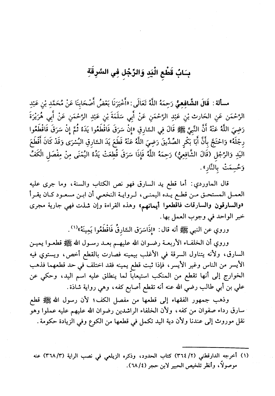 قَالَ الشَّافِعِيُّ رَحِمَهُ اللَّهُ تَعَالَى: " أَخْبَرَنَا بَعْضُ أَصْحَابِنَا عَنْ مُحَمَّدِ بْنِ عَبْدِ الرحمن عَنِ الْحَارِثِ بْنِ عَبْدِ الرَّحْمَنِ عَنْ أَبِي سَلَمَةَ بْنِ عَبْدِ الرَّحْمَنِ عَنْ أَبِي هُرَيْرَةَ رَضِيَ اللَّهُ عَنْهُ أَنَّ النَّبِيَّ - صَلَّى اللَّهُ عَلَيْهِ وَسَلَّم َ - قَالَ فِي السَّارِقِ " إِنْ سَرَقَ فَاقْطَعُوا يَدَهُ ثم إن سرق فاقطعوا رجله) واحتج بأن أبا بكر الصديق رضي الله عنه قطع يد السارق اليسرى وقد كان أقطع اليد والرجل (قال الشافعي) رحمه الله فَإِذَا سَرَقَ قُطِعَتْ يَدُهُ الْيُمْنَى مِنْ مِفْصَلِ الكف وحسمت بِالنَّارِ) .