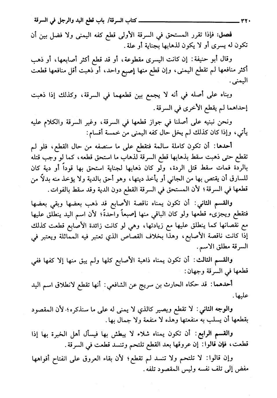 وَنَحْنُ نَبْنِيهِ عَلَى أَصْلِنَا في جواز قطعها فِي السَّرِقَةِ، وَغَيْرِ السَّرِقَةِ وَالْكَلَامُ عَلَيْهِ يَأْتِي، وَإِذَا كَانَ كَذَلِكَ لَمْ يَخْلُ حَالُ كَفِّهِ الْيُمْنَى مِنْ خَمْسَةِ أَقْسَامٍ: