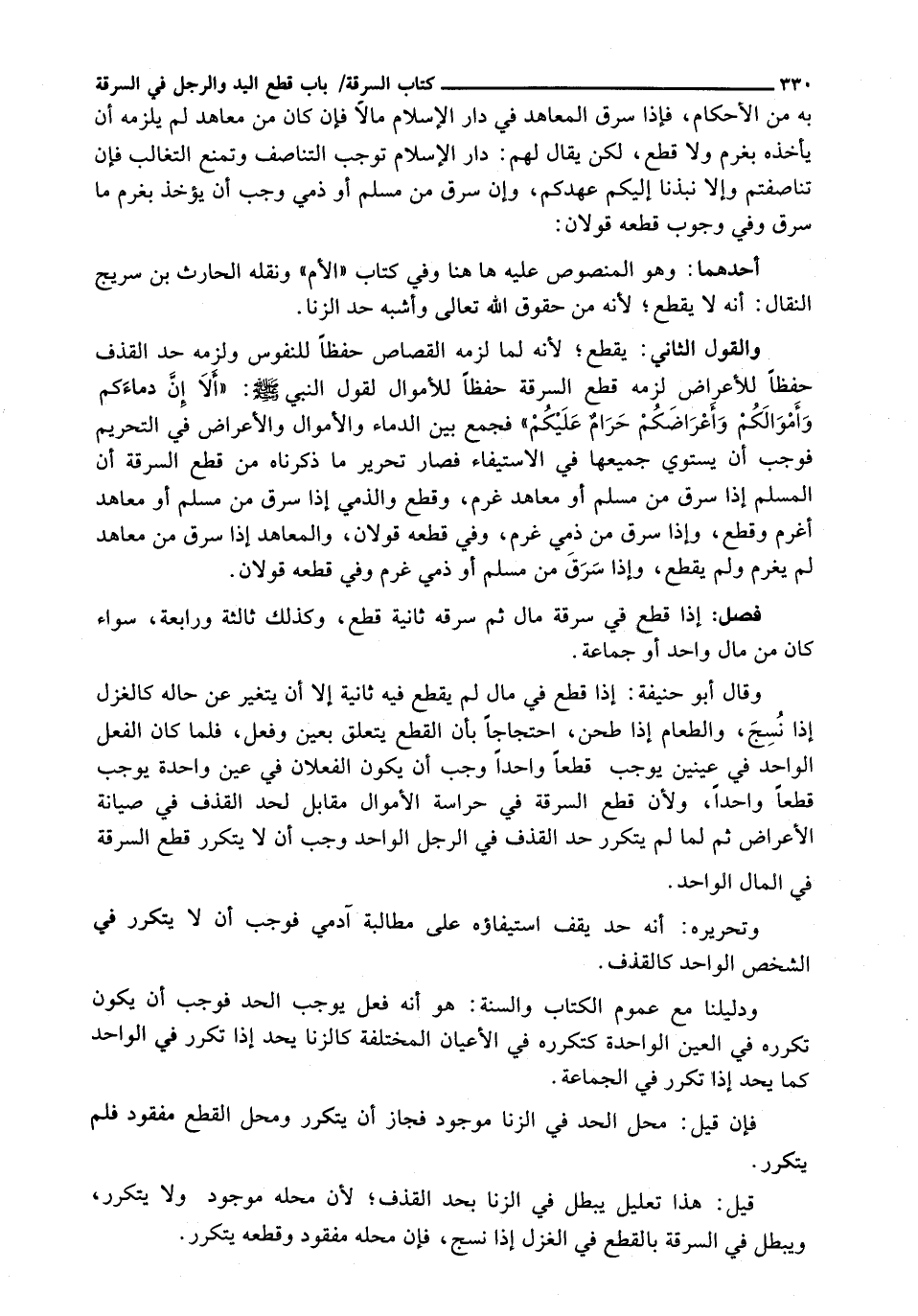 وَالْقَوْلُ الثَّانِي: يُقْطَعُ؛ لِأَنَّهُ لَمَّا لَزِمَهُ الْقِصَاصُ حِفْظًا لِلنُّفُوسِ وَلَزِمَهُ حَدُّ الْقَذْفِ حِفْظًا لِلْأَعْرَاضِ لَزِمَهُ قَطْعُ السَّرِقَةِ حِفْظًا لِلْأَمْوَالِ لقول النبي - صَلَّى اللَّهُ عَلَيْهِ وَسَلَّم َ -: " ألا إن دماءكم وأموالكم وأعرضكم حَرَامٌ عَلَيْكُمْ) فَجَمَعَ بَيْنَ الدِّمَاءِ وَالْأَمْوَالِ وَالْأَعْرَاضِ فِي التَّحْرِيمِ فَوَجَبَ أَنْ يَسْتَوِيَ جَمِيعُهَا فِي الاستيفاء فصار تَحْرِيرُ مَا ذَكَرْنَاهُ مِنْ قَطْعِ السَّرِقَةِ أَنَّ الْمُسْلِمَ إِذَا سَرَقَ مِنْ مُسْلِمٍ أَوْ مُعَاهَدٍ غَرِمَ، وَقُطِعَ وَالذِّمِّيَّ إِذَا سَرَقَ مِنْ مُسْلِمٍ أو معاهد أغرم وقطع، وإذا سَرَقَ مِنْ ذِمِّيٍّ غُرِّمَ، وَفِي قَطْعِهِ قَوْلَانِ، وَالْمُعَاهَدُ إِذَا سَرَقَ مِنْ مُعَاهَدٍ لَمْ يُغَرَّمْ وَلَمْ يُقْطَعْ، وَإِذَا سَرَقَ مِنْ مُسْلِمٍ أَوْ ذمي غرم وَفِي قَطْعِهِ قَوْلَانِ: