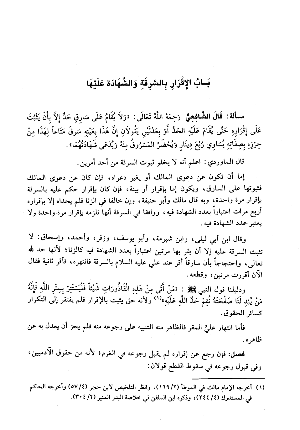 قال الشافعي رحمه الله تعالى: " وَلَا يُقَامُ عَلَى سَارِقٍ حَدٌّ إِلَّا بِأَنْ يَثْبُتَ عَلَى إِقْرَارِهِ حَتَّى يُقَامَ عَلَيْهِ الْحَدُّ أو بعدلين يقولان إِنَّ هَذَا بِعَيْنِهِ سَرَقَ مَتَاعًا لِهَذَا مِنْ حرزه بصفاته يُسَاوِي رُبُعَ دِينَارٍ وَيُحْضَرُ الْمَسْرُوقُ مِنْهُ وَيَدَّعِي شَهَادَتَهُمَا) .