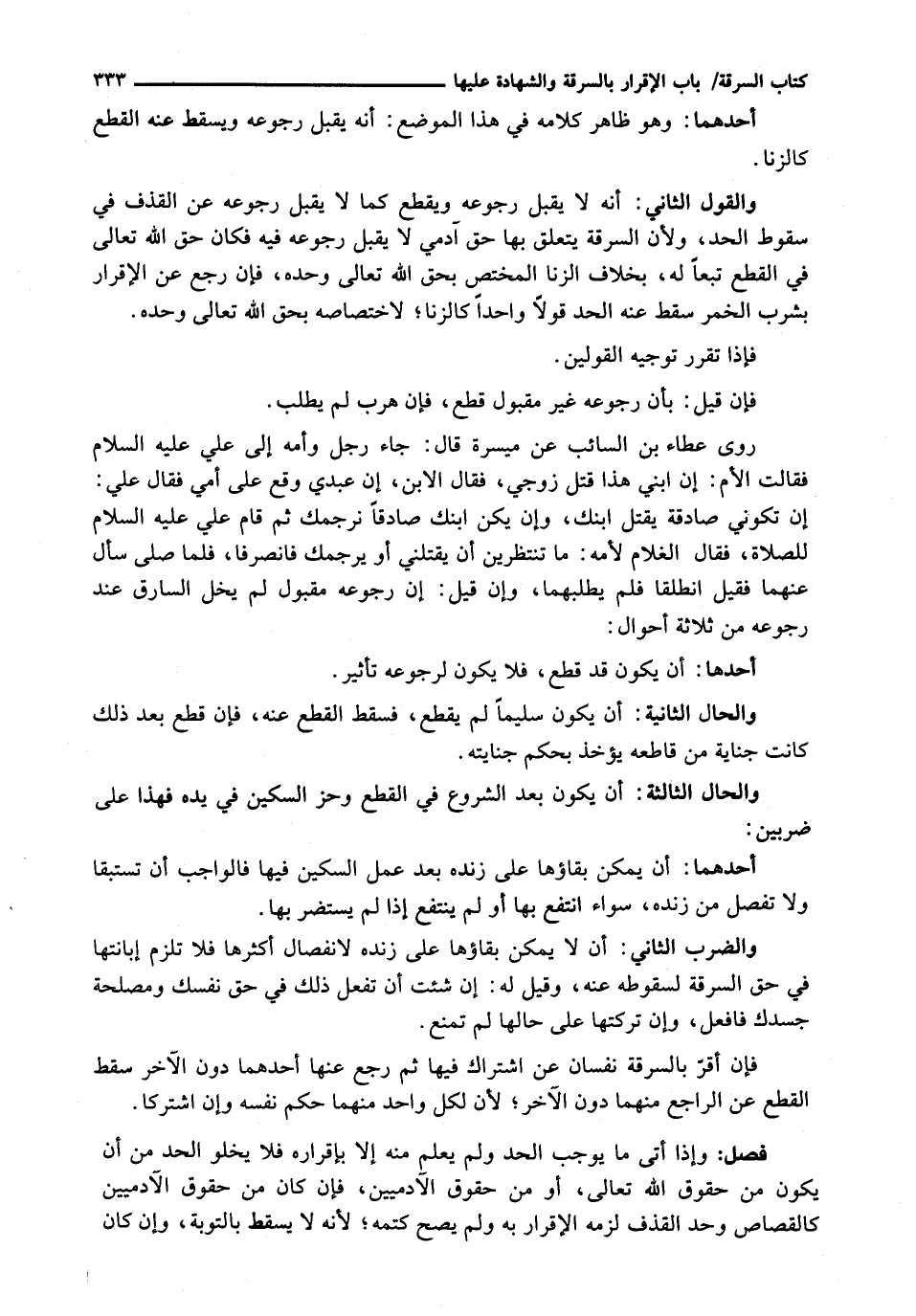 رَوَى عَطَاءُ بْنُ السَّائِبِ عَنْ مَيْسَرَةَ قَالَ: جَاءَ رَجُلٌ وَأُمُّهُ إِلَى عَلِيٍّ عليه السلام فقالت الأم: إن ابني هذا قَتَلَ زَوْجِي، فَقَالَ الِابْنُ، إِنَّ عَبْدِي وَقَعَ عَلَى أُمِّي فَقَالَ عَلِيٌّ: إِنْ تَكُونِي صَادِقَةً يُقْتَلُ ابْنُكِ، وَإِنْ يَكُنِ ابْنُكِ صَادِقًا نَرْجُمُكِ ثم قام علي عليه السلام لِلصَّلَاةِ، فَقَالَ الْغُلَامُ لِأُمِّهِ: مَا تَنْتَظِرِينَ أَنْ يقتلني أو يرجمك فانصرفا، فلما صلى سَأَلَ عَنْهُمَا فَقِيلَ انْطَلَقَا فَلَمْ يَطْلُبْهُمَا، وَإِنْ قِيلَ: إِنَّ رُجُوعَهُ مَقْبُولٌ لَمْ يَخْلُ السَّارِقُ عِنْدَ رُجُوعِهِ مِنْ ثَلَاثَةِ أَحْوَالٍ: