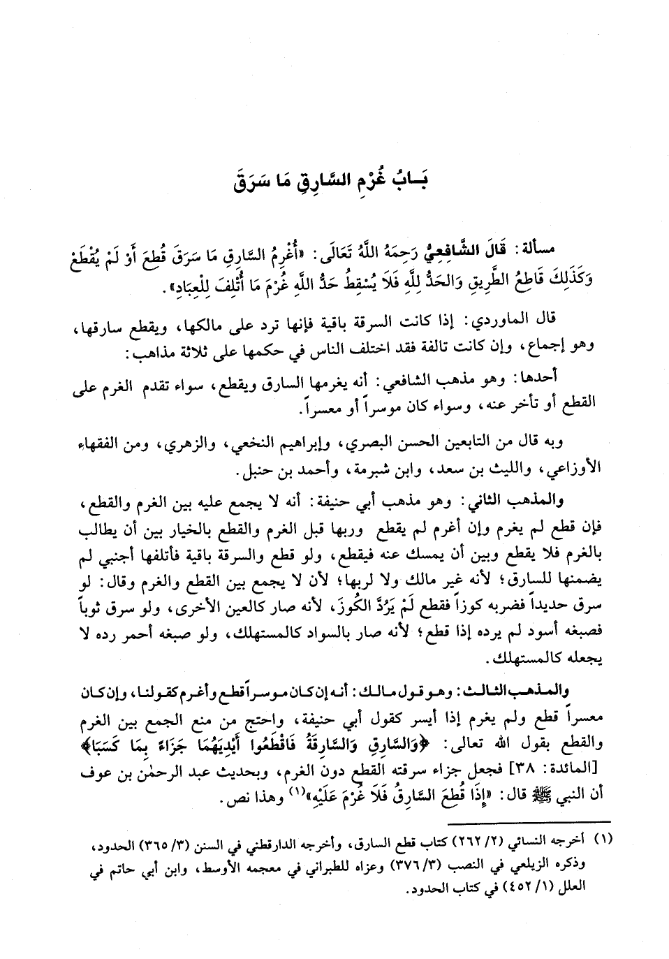 قال الشافعي رحمه الله تعالى: " أُغَرِّمُ السَّارِقَ مَا سَرَقَ قُطِعَ أَوْ لَمْ يقطع وكذلك قاطع الطريق والحد لله فلا يُسْقَطُ حَدُّ اللَّهِ غُرْمَ مَا أُتْلِفَ لِلْعِبَادِ) .