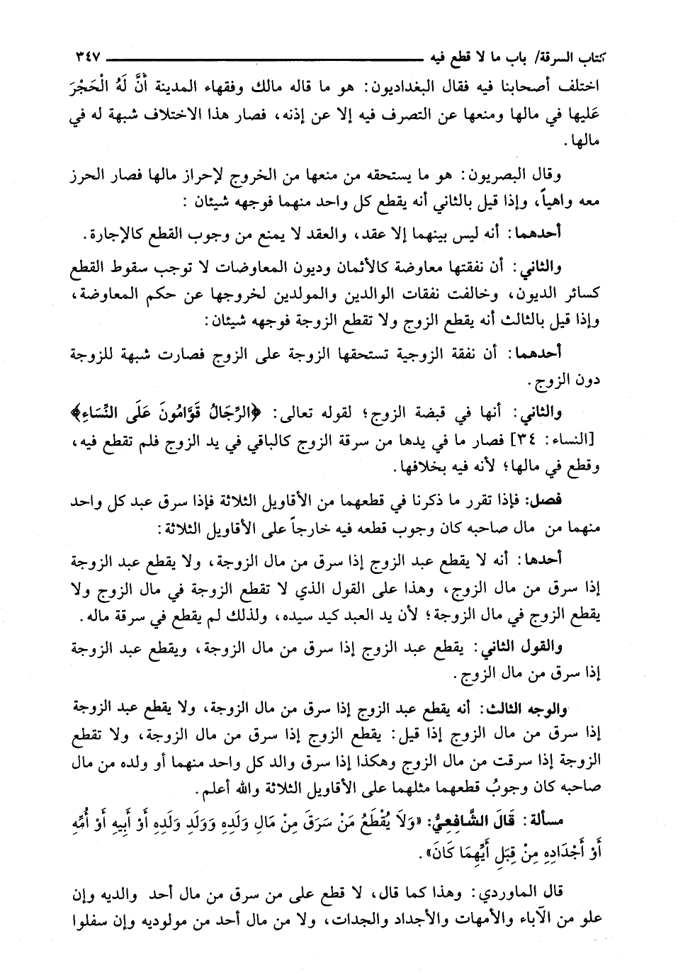 وَالثَّانِي: أَنَّهَا فِي قَبْضَةِ الزَّوْجِ؛ لِقَوْلِهِ تَعَالَى: {الرِّجَالُ قَوَّامُونَ عَلَى النِّسَاءِ} [النساء: 34] فَصَارَ مَا في يدها مِنْ سَرِقَةِ الزَّوْجِ كَالْبَاقِي فِي يَدِ الزَّوْجِ فَلَمْ تُقْطَعْ فِيهِ، وَقُطِعَ فِي مَالِهَا؛ لِأَنَّهُ فِيهِ بِخِلَافِهَا.