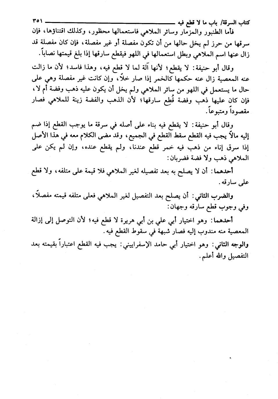 فَأَمَّا الطُّنْبُورُ وَالْمِزْمَارُ وَسَائِرُ الْمَلَاهِي فَاسْتِعْمَالُهَا مَحْظُورٌ، وكذلك اقتناؤها، فإن سرقها مِنْ حِرْزٍ لَمْ يَخْلُ حَالُهَا مِنْ أَنْ تكون مفصلة أو غير مفصلة، فإن كان مُفَصَّلَةً قَدْ زَالَ عَنْهَا اسْمُ الْمَلَاهِي وَبَطَلَ اسْتِعْمَالُهَا فِي اللَّهْوِ فَيُقْطَعُ سَارِقُهَا إِذَا بَلَغَ قِيمَتُهَا نِصَابًا.
