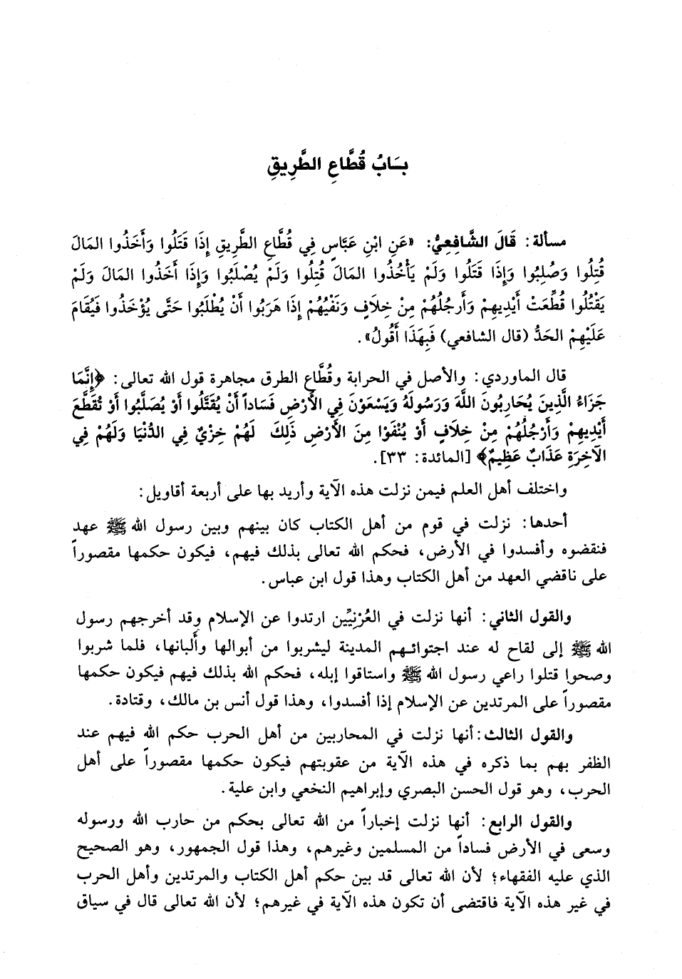 قال الشافعي: " عَنِ ابْنِ عَبَّاسٍ فِي قُطَّاعِ الطَّرِيقِ إِذَا قَتَلُوا وَأَخَذُوا الْمَالَ قُتِّلُوا وَصُلِّبُوا وَإِذَا قَتَلُوا وَلَمْ يَأْخُذُوا الْمَالَ قُتِّلُوا وَلَمْ يُصَلَّبُوا وَإِذَا أَخَذُوا الْمَالَ وَلَمْ يَقْتُلُوا قُطِعَتْ أَيْدِيهِمْ وَأَرْجُلُهُمْ مِنْ خِلَافٍ وَنَفْيُهُمْ إِذَا هَرَبُوا أَنْ يُطْلَبُوا حَتَّى يُؤْخَذُوا فَيُقَامَ عَلَيْهِمُ الْحَدُّ (قَالَ الشَّافِعِيُّ) فبهذا أقول) .