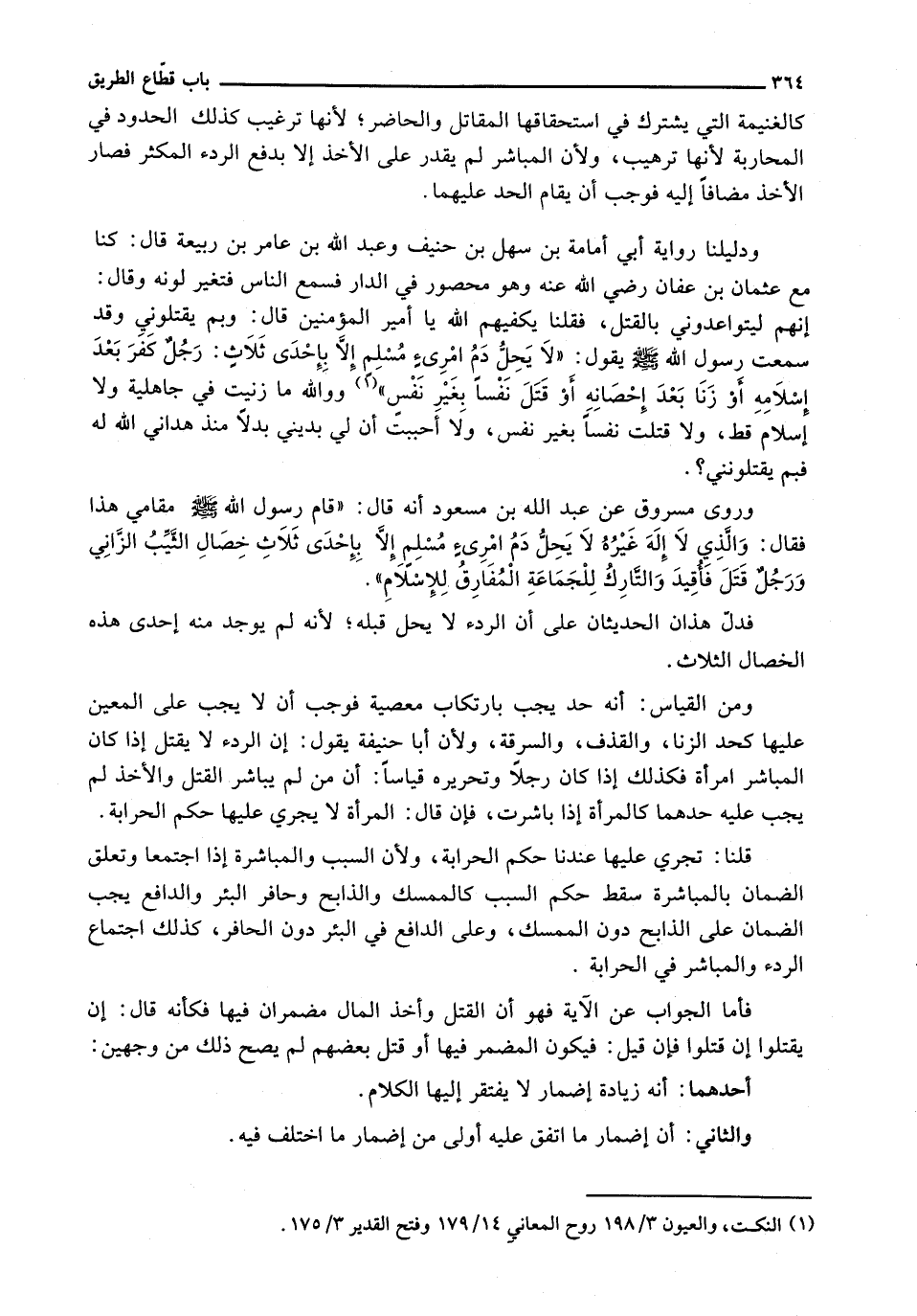 وَدَلِيلُنَا رِوَايَةُ أَبِي أُمَامَةَ بْنِ سَهْلِ بْنِ حُنَيْفٍ وَعَبْدِ الله بن عامر بن ربيعة قال: كنا مع عُثْمَانُ بْنُ عَفَّانَ رَضِيَ اللَّهُ عَنْهُ وَهُوَ مَحْصُورٌ فِي الدَّارِ فَسَمِعَ النَّاسَ فَتَغَيَّرَ لونه وقال: إنهم ليتواعدوني بالقتل، فقلنا يكفيهم الله يا أمير المؤمنين قال: وبم يَقْتُلُونِي وَقَدْ سَمِعْتُ رَسُولَ اللَّهِ - صَلَّى اللَّهُ عَلَيْهِ وَسَلَّم َ - يَقُولُ: " لَا يَحِلُّ دَمُ امْرِئٍ مُسْلِمٍ إِلَّا بِإِحْدَى ثلاث: رجل كفر بعد إسلامه أو زنا بعد إحصانه أو قتل نفسا بِغَيْرِ نَفْسٍ) وَوَاللَّهِ مَا زَنَيْتُ فِي جَاهِلِيَّةٍ وَلَا إِسْلَامٍ قَطُّ، وَلَا قَتَلْتُ نَفْسًا بِغَيْرِ نَفْسٍ، وَلَا أَحْبَبُتُ أَنَّ لِي بِدِينِي بَدَلًا منذ هداني الله له فَبِمَ يَقْتُلُونَنِي؟ .