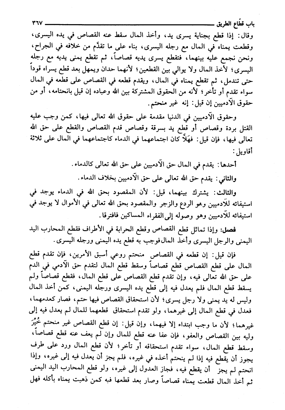 فَإِنْ قِيلَ: إِنَّ قَطْعَهُ فِي الْقِصَاصِ مُنْحَتِمٌ رُوعِيَ أَسْبَقُ الْأَمْرَيْنِ، فَإِنْ تَقَدَّمَ قَطْعُ الْمَالِ عَلَى قَطْعِ الْقِصَاصِ قطع قصاصاً وسقط قطع المال لتقدم حَقِّ الْآدَمِيِّ فِي الدَّمِ عَلَى حَقِّ اللَّهِ تَعَالَى فِيهِ، وَإِنْ تَقَدَّمَ قَطْعُ الْقِصَاصِ عَلَى قطع المال، فقطع قصاصاً ولم يسقط قطع المال فلم يُعْدَلُ فِيهِ إِلَى قَطْعِ يَدِهِ الْيُسْرَى وَرِجْلِهِ الْيُمْنَى، كَمَنْ أَخَذَ الْمَالَ وَلَيْسَ لَهُ يَدٌ يمنى ولا رجل يسرى؛ لأن اسْتِحْقَاقُ قَطْعِهِمَا لِلْمَالِ لَمْ يُعْدَلْ فِيهِ إِلَى فَعَدَلَ فِي قَطْعِ الْمَالِ إِلَى غَيْرِهِمَا، وَلَوْ تقدم استحقاق القصاص فيها حَتْمٌ، فَصَارَ كَعَدَمِهِمَا، فَعَدَلَ فِي قَطْعِ الْمَالِ إِلَى غَيْرِهِمَا، وَلَوْ تَقَدَّمَ اسْتِحْقَاقُ قَطْعِهِمَا لِلْمَالِ لم يعدل فيه إلى غيرهما؛ لأن مَا وَجَبَ ابْتِدَاءً إِلَّا فِيهِمَا، وَإِنْ قِيلَ: إِنَّ قَطْعَ الْقِصَاصِ غَيْرُ مُنْحَتِمٍ خُيِّرَ وَلِيُّهُ بَيْنَ الْقِصَاصِ وَالْعَفْوِ، فَإِنْ عَفَا عَنْهُ قُطِعَ لِلْمَالِ وَإِنْ لَمْ يَعْفُ عَنْهُ قُطِعَ قِصَاصًا، وَسَقَطَ قَطْعُ الْمَالِ، سَوَاءٌ تَقَدَّمَ اسْتِحْقَاقُهُ أَوْ تَأَخَّرَ؛ لِأَنَّ قَطْعَ الْمَالِ وَرَدَ عَلَى طَرَفٍ يَجُوزُ أَنْ يُقْطَعَ فِيهِ إِذَا لَمْ يَنْحَتِمْ أَخْذُهُ فِي غَيْرِهِ، فَلَمْ يَجُزْ أَنْ يُعْدَلَ فِيهِ إِلَى غَيْرِهِ، وَإِذَا انْحَتَمَ لَمْ يَجُزْ أَنْ يُقْطَعَ فِيهِ، فَجَازَ الْعُدُولُ إِلَى غَيْرِهِ، وَلَوْ قُطِعَ الْمُحَارِبُ الْيَدَ الْيُمْنَى ثُمَّ أَخَذَ الْمَالَ قُطِعَتْ يُمْنَاهُ قِصَاصًا وَصَارَ بَعْدَ قَطْعِهَا فيه كمن ذهبت يمناه بأكله فهل