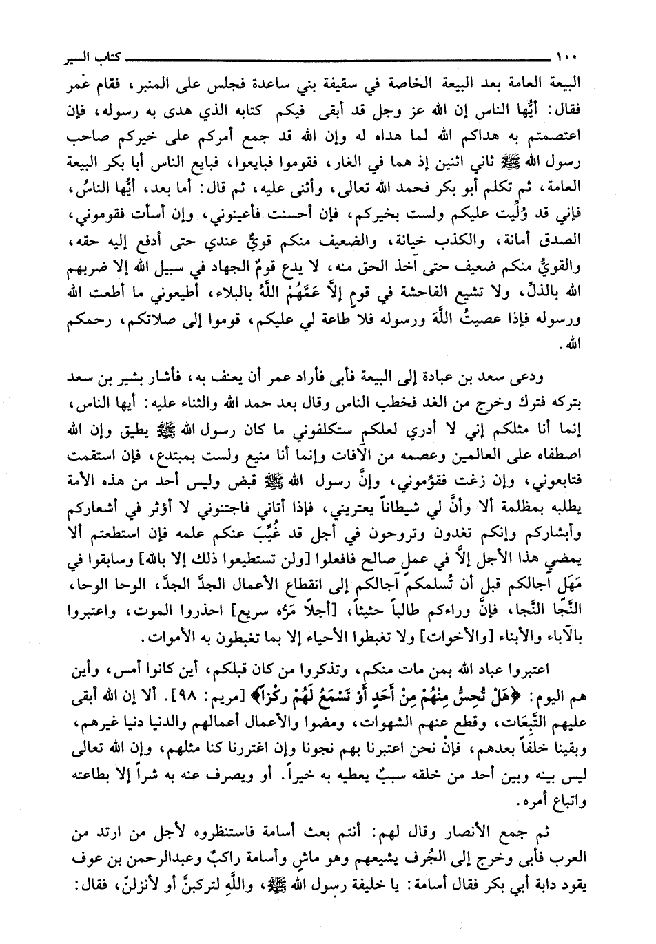 الْبَيْعَةَ الْعَامَّةَ بَعْدَ الْبَيْعَةِ الْخَاصَّةِ فِي سَقِيفَةِ بَنِي سَاعِدَةَ فَجَلَسَ عَلَى الْمِنْبَرِ، فَقَامَ عُمَرُ فَقَالَ: أَيُّهَا النَّاسُ إِنَّ اللَّهَ عَزَّ وَجَلَّ قَدْ أَبْقَى فِيكُمْ كِتَابَهُ الَّذِي هَدَى بِهِ رَسُولَهُ، فَإِنِ اعْتَصَمْتُمْ بِهِ هُدَاكُمُ اللَّهُ لِمَا هَدَاهُ لَهُ وَإِنَّ اللَّهَ قَدْ جَمَعَ أَمْرَكُمْ عَلَى خَيْرِكُمْ صَاحِبِ رَسُولِ اللَّهِ - صَلَّى اللَّهُ عَلَيْهِ وَسَلَّم َ - ثَانِي اثْنَيْنِ إِذْ هُمَا فِي الْغَارِ، فَقُومُوا فَبَايِعُوا، فَبَايَعَ النَّاسُ أَبَا بَكْرٍ الْبَيْعَةَ الْعَامَّةَ، ثُمَّ تَكَلَّمَ أَبُو بَكْرٍ فَحَمِدَ اللَّهَ تَعَالَى، وَأَثْنَى عَلَيْهِ، ثُمَّ قَالَ: أَمَّا بَعْدُ، أَيُّهَا النَّاسُ فَإِنِّي قَدْ وُلِّيتُ عَلَيْكُمْ وَلَسْتُ بِخَيْرِكُمْ، فَإِنْ أَحْسَنْتُ فَأَعِينُونِي، وَإِنْ أَسَأْتُ فَقَوِّمُونِي الصِّدْقُ أَمَانَةٌ، وَالْكَذِبُ خِيَانَةٌ، وَالضَّعِيفُ مِنْكُمْ قَوِيٌّ عِنْدِي حَتَّى أَدْفَعَ إِلَيْهِ حَقَّهُ وَالْقَوِيُّ مِنْكُمْ ضَعِيفٌ حَتَّى آخُذَ الْحَقَّ مِنْهُ، لَا يَدَعُ قَوْمٌ الْجِهَادَ فِي سَبِيلِ اللَّهِ إِلَّا ضَرَبَهُمُ اللَّهُ بِالذُّلِّ، وَلَا تَشِيعُ الْفَاحِشَةُ فِي قَوْمٍ إِلَّا عَمَّهُمُ اللَّهُ بِالْبَلَاءِ، أَطِيعُونِي مَا أَطَعْتُ اللَّهَ وَرَسُولَهُ فَإِذَا عَصَيْتُ اللَّهَ وَرَسُولَهُ فَلَا طَاعَةَ لِي عَلَيْكُمْ، قُومُوا إِلَى صَلَاتِكُمْ، رَحِمَكُمُ اللَّهُ