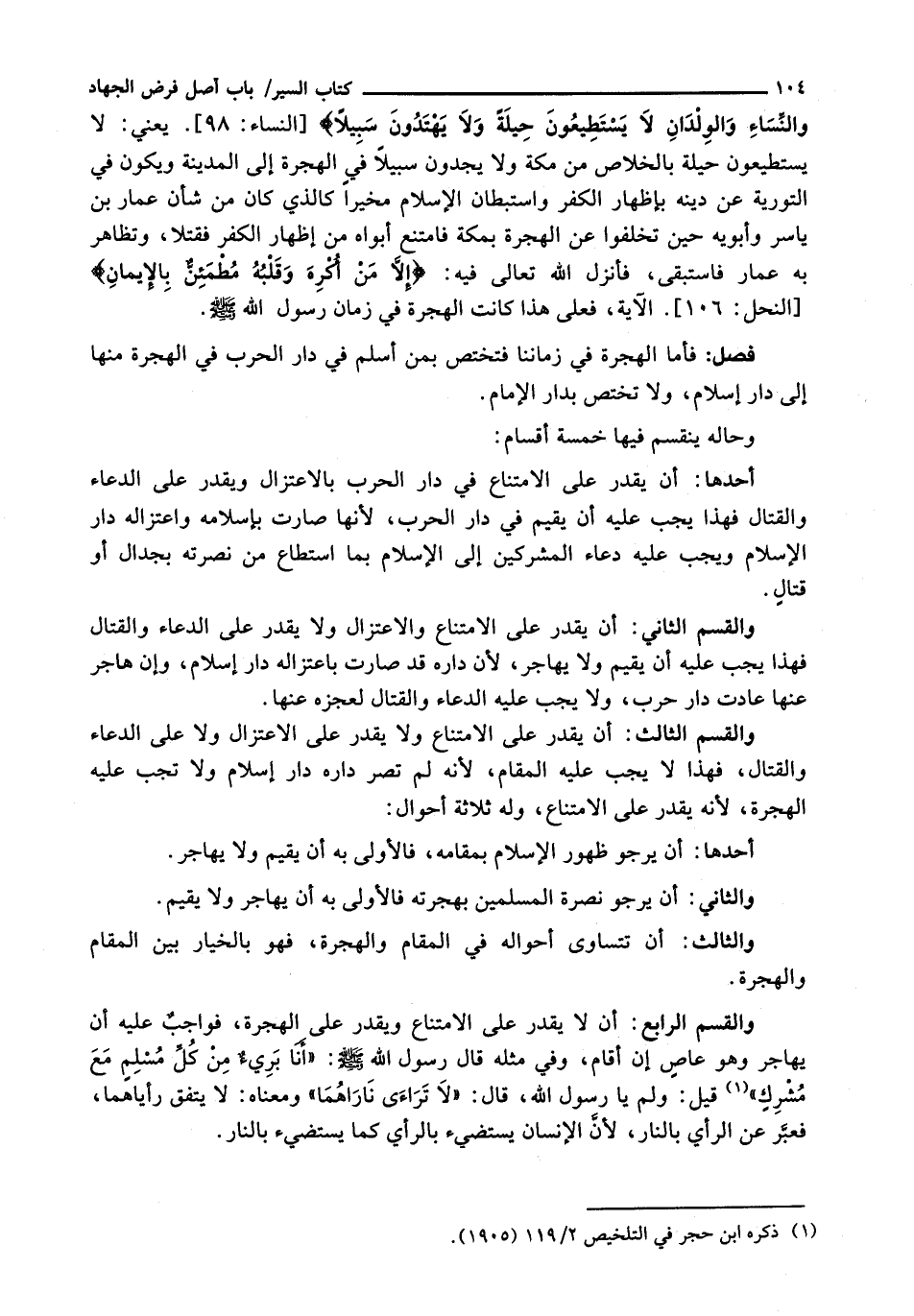 فَصْلٌ: فَأَمَّا الْهِجْرَةُ فِي زَمَانِنَا فَتَخْتَصُّ بِمَنْ أَسْلَمَ فِي دَارِ الْحَرْبِ فِي الْهِجْرَةِ مِنْهَا إِلَى دَارِ إِسْلَامٍ، وَلَا تَخْتَصُّ بِدَارِ الْإِمَامِ