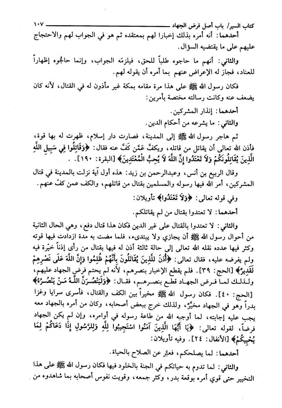 ثُمَّ هَاجَرَ رَسُولُ اللَّهِ - صَلَّى اللَّهُ عَلَيْهِ وَسَلَّم َ - إِلَى الْمَدِينَةِ، فَصَارَتْ دَارَ إِسْلَامٍ، ظَهَرَتْ لَهُ بِهَا قُوَّةٌ، فَأَذِنَ اللَّهُ تَعَالَى أَنْ يُقَاتِلَ مَنْ قَاتَلَهُ، وَيَكُفَّ عَمَّنْ كَفَّ عَنْهُ فَقَالَ: {وَقَاتِلُوا فِي سَبِيلِ اللَّهِ الَّذِينَ يُقَاتِلُونَكُمْ وَلا تَعْتَدُوا إِنَّ اللَّهَ لا يُحِبُّ الْمُعْتَدِينَ} [البقرة: 190] .