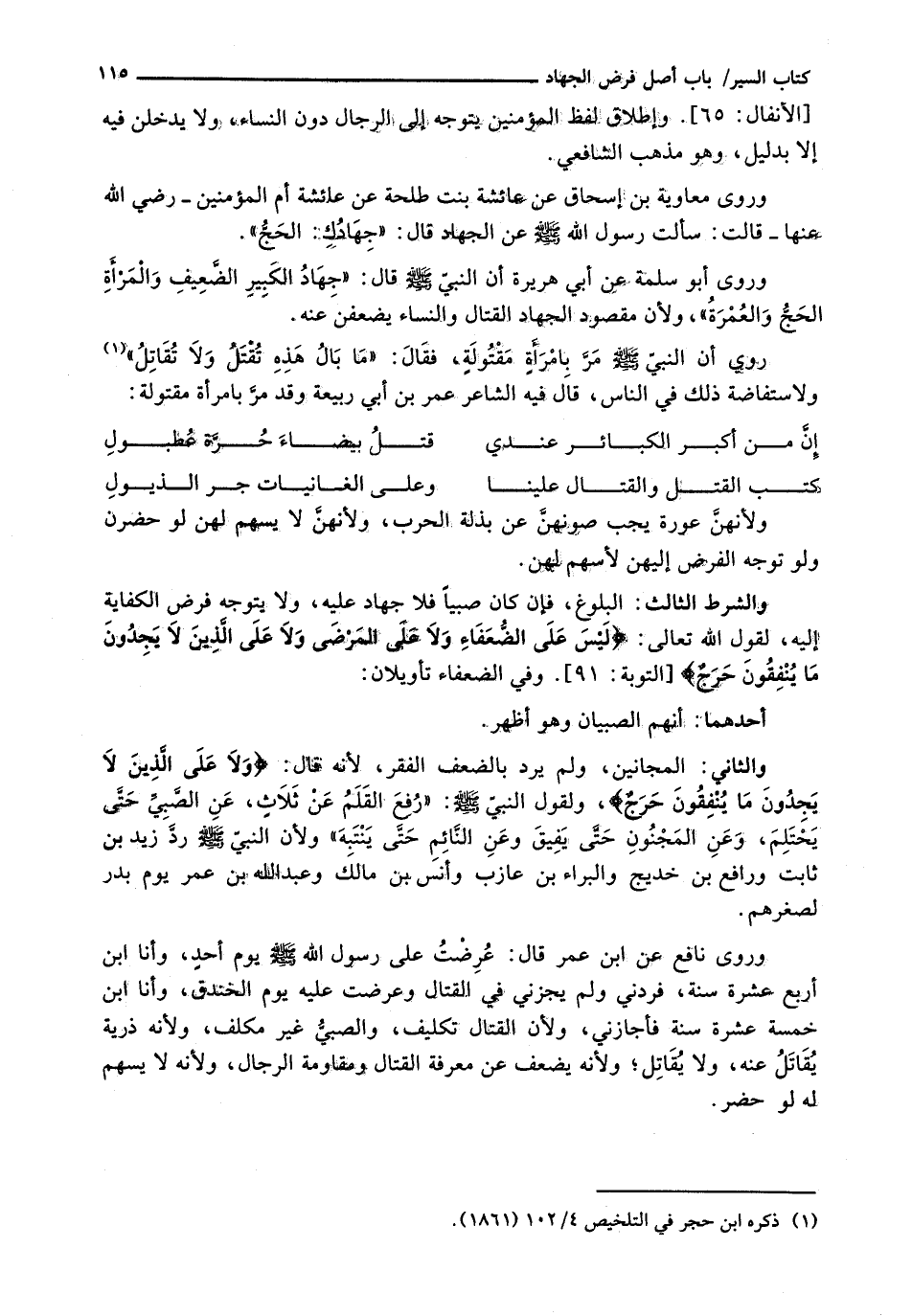وَلِأَنَّهُنَّ عَوْرَةٌ يَجِبُ صَوْنُهُنَّ عَنْ بِذْلَةِ الْحَرْبِ، وَلِأَنَّهُنَّ لَا يُسْهَمُ لَهُنَّ لَوْ حَضَرْنَ وَلَوْ تَوَجَّهَ الْفَرْضُ إِلَيْهِنَّ لَأُسْهِمَ لَهُنَّ. وَالشَّرْطُ الثَّالِثُ: البلوغ، فإ، كان صبياً قلا جِهَادَ عَلَيْهِ، وَلَا يَتَوَجَّهُ فَرْضُ الْكِفَايَةِ إِلَيْهِ، لِقَوْلِ اللَّهِ تَعَالَى: {لَيْسَ عَلَى الضُّعَفَاءِ وَلا عَلَى الْمَرْضَى وَلا عَلَى الَّذِينَ لا يَجِدُونَ مَا يُنْفِقُونَ حَرَجٌ} [التوبة: 91] وَفِي الضُّعَفَاءِ تَأْوِيلَانِ: أَحَدُهُمَا: أَنَّهُمُ الصِّبْيَانُ وَهُوَ أَظْهَرُ. وَالثَّانِي: الْمَجَانِينُ، وَلَمْ يُرِدْ بِالضَّعْفِ الْفَقْرَ، لِأَنَّهُ قَالَ: {وَلا عَلَى الَّذِينَ لا يَجِدُونَ مَا يُنْفِقُونَ حَرَجٌ} ، ولقول النبي - صَلَّى اللَّهُ عَلَيْهِ وَسَلَّم َ -: " رُفِعَ الْقَلَمُ عَنْ ثَلَاثٍ، عَنِ الصَّبِيِّ حَتَّى يَحْتَلِمَ، وَعَنِ الْمَجْنُونِ حَتَّى يَفِيقَ وَعَنِ النَّائِمِ حَتَّى يتنبه " ولأن النبي - صَلَّى اللَّهُ عَلَيْهِ وَسَلَّم َ - رَدَّ زَيْدَ بْنَ ثَابِتٍ، وَرَافِعَ بْنَ خَدِيجٍ وَالْبَرَاءَ بْنَ عَازِبٍ وَأَنَسَ بْنَ مَالِكٍ وَعَبْدَ اللَّهِ بْنَ عُمَرَ يَوْمَ بَدْرٍ لِصِغَرِهِمْ. وَرَوَى نَافِعٍ عَنِ ابْنِ عُمَرَ قَالَ: عُرِضْتُ عَلَى رَسُولِ اللَّهِ - صَلَّى اللَّهُ عَلَيْهِ وَسَلَّم َ - يَوْمَ أُحُدٍ، وَأَنَا ابْنُ أَرْبَعَ عَشْرَةَ سَنَةً، فَرَدَّنِي وَلَمْ يُجِزْنِي فِي الْقِتَالِ وَعُرِضْتُ عَلَيْهِ يوم الخندق، وأنا ابن خمسة عَشْرَةَ سَنَةً فَأَجَازَنِي، وَلِأَنَّ الْقِتَالَ تَكْلِيفٌ، وَالصَّبِيُّ غَيْرُ مُكَلَّفٍ، وَلِأَنَّهُ ذُرِّيَّةٌ يُقَاتَلُ عَنْهُ، وَلَا يُقَاتِلُ، وَلِأَنَّهُ يَضْعُفُ عَنْ مَعْرِفَةِ الْقِتَالِ وَمُقَاوَمَةِ الرِّجَالِ، وَلِأَنَّهُ لَا يُسْهَمُ لَهُ لَوْ حَضَرَ.