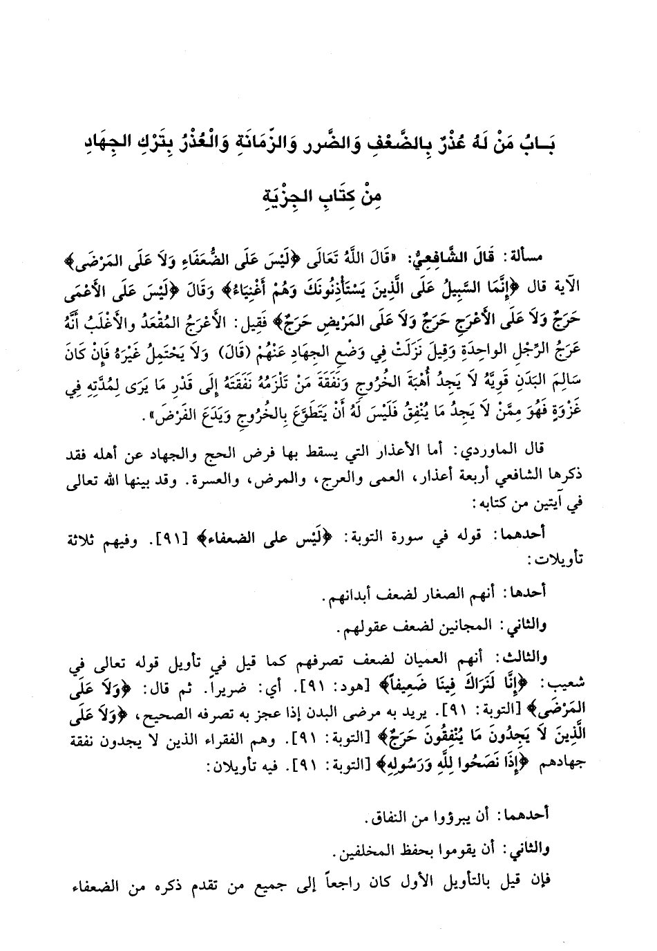 قَالَ الْمَاوَرْدِيُّ: أَمَّا الْأَعْذَارُ الَّتِي يَسْقُطُ بِهَا فَرْضُ الْحَجِّ وَالْجِهَادِ عَنْ أَهْلِهِ فَقَدْ ذَكَرَهَا الشَّافِعِيُّ أَرْبَعَةَ أَعْذَارٍ، الْعَمَى وَالْعَرَجُ، وَالْمَرَضُ، وَالْعُسْرَةُ. وَقَدْ بَيَّنَهَا اللَّهُ تَعَالَى فِي آيَتَيْنِ مِنْ كِتَابِهِ: