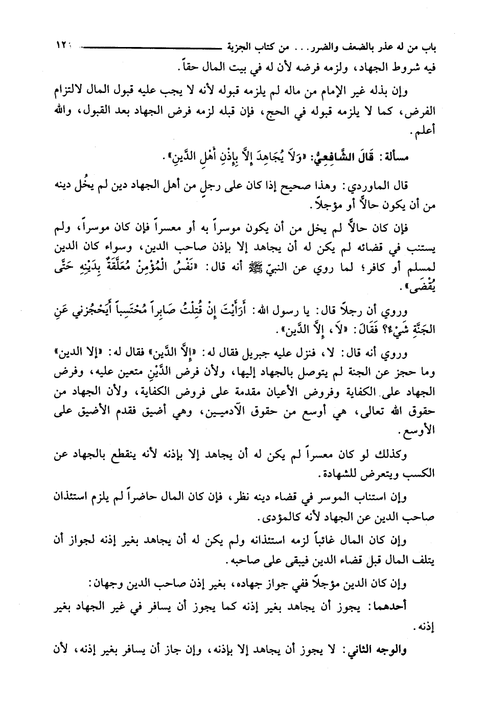 : قال الشافعي: " وَلَا يُجَاهِدَ إِلَّا بِإِذْنِ أَهْلِ الدَّيْنِ ".