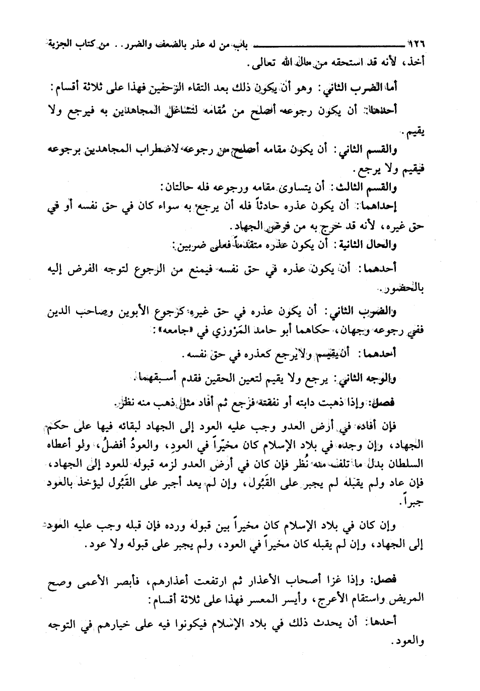 : وَإِذَا غَزَا أَصْحَابُ الْأَعْذَارِ ثُمَّ ارْتَفَعَتْ أَعْذَارُهُمْ، فَأَبْصَرَ الْأَعْمَى وَصَحَّ الْمَرِيضُ وَاسْتَقَامَ الْأَعْرَجُ، وَأَيْسَرَ الْمُعْسِرُ فَهَذَا عَلَى ثَلَاثَةِ أَقْسَامٍ: