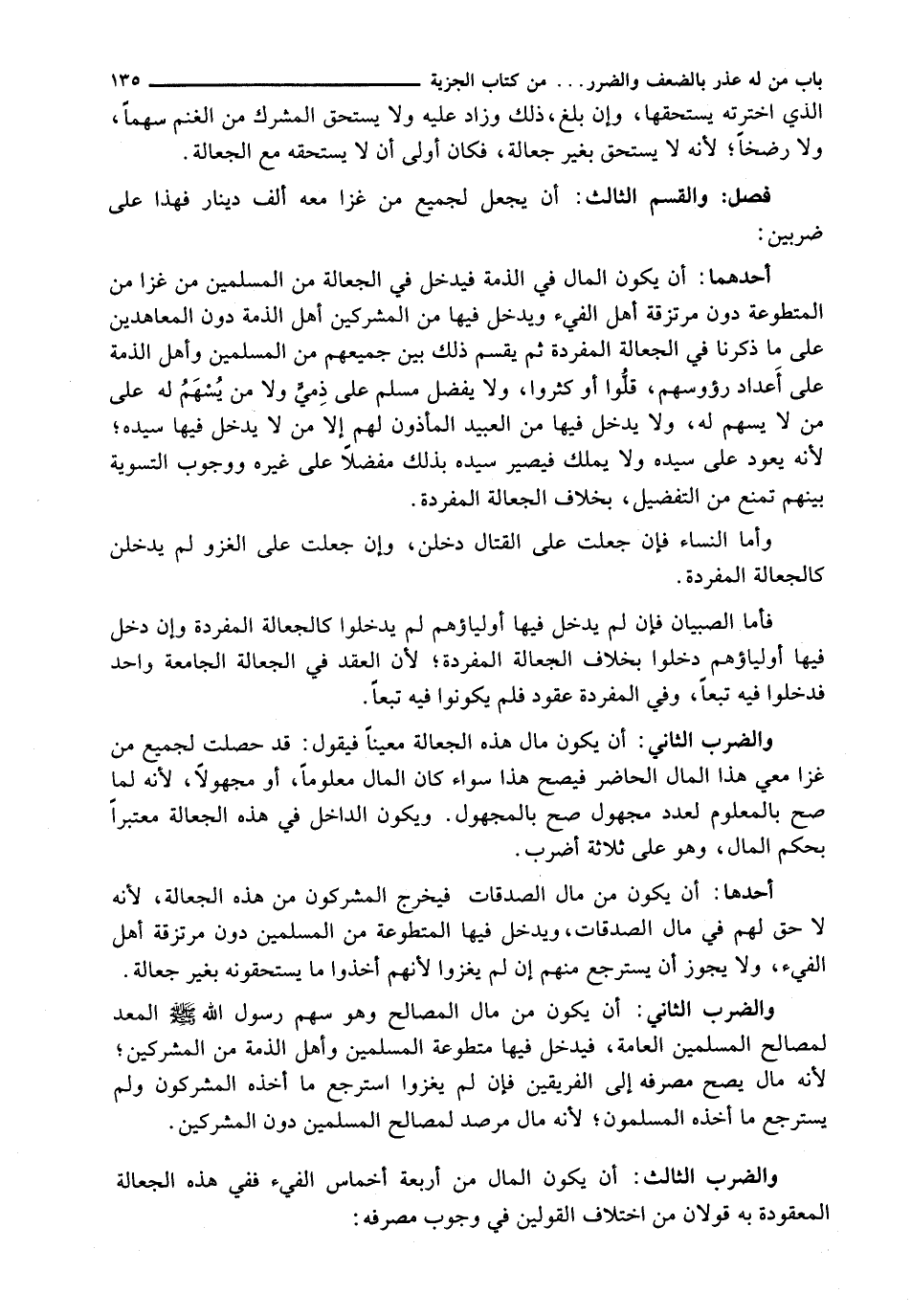وَالضَّرْبُ الثَّانِي: أَنْ يَكُونَ مِنْ مَالِ الْمَصَالِحِ وَهُوَ سَهْمِ رَسُولِ اللَّهِ - صَلَّى اللَّهُ عَلَيْهِ وَسَلَّم َ - الْمُعَدُّ لِمَصَالِحِ الْمُسْلِمِينَ الْعَامَّةِ، فَيَدْخُلُ فِيهَا مُتَطَوِّعَةُ المسلمين وأهل الذمة من المشركين؛ لأنه ما ل يصح مصرفه إلى الفريقين فإن لم يغزو اسْتُرْجِعَ مَا أَخَذَهُ الْمُشْرِكُونَ وَلَمْ يُسْتَرْجَعْ مَا أَخَذَهُ الْمُسْلِمُونَ؛ لِأَنَّهُ مَالٌ مُرْصَدٌ لِمَصَالِحِ الْمُسْلِمِينَ دُونَ الْمُشْرِكِينَ.