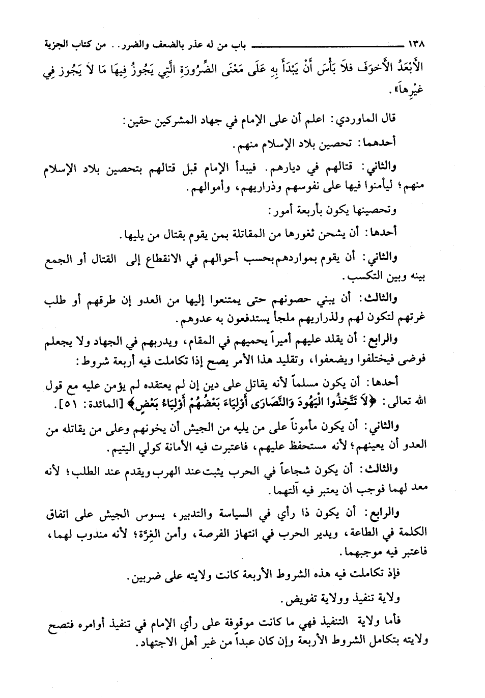 وَالرَّابِعُ: أَنْ يُقَلِّدَ عَلَيْهِمْ أَمِيرًا يَحْمِيهِمْ فِي الْمَقَامِ، وَيُدَرِّبُهُمْ فِي الجهاد ولا يجعلهم فوضى فيختلفوا ويضعفوا، وَتَقْلِيدُ هَذَا الْأَمْرِ يَصِحُّ إِذَا تَكَامَلَتْ فِيهِ أَرْبَعَةُ شُرُوطٍ: