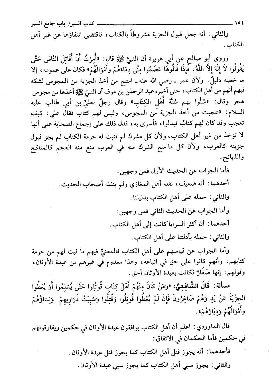: قال الشافعي: " وَمَنْ كَانَ مِنْهُمْ أَهْلَ كِتَابٍ قُوتِلُوا حَتَّى يُسْلِمُوا أَوْ يُعْطُوا الْجِزْيَةَ عَنْ يَدٍ وَهُمْ صَاغِرُونَ فَإِنْ لَمْ يُعْطُوا قُوتِلُوا وَقُتِلُوا وَسُبِيَتْ ذَرَارِيهِمْ وَنِسَاؤُهُمْ وَأَمَوَالُهُمْ وَدِيَارُهُمْ ".