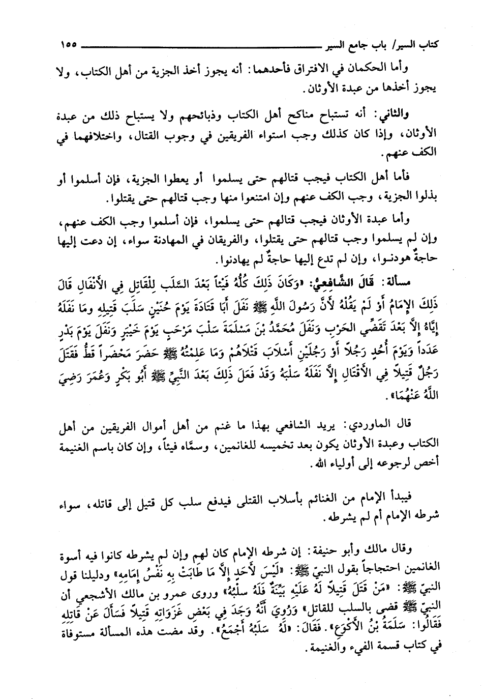 : قال الشافعي: " وَكَانَ ذَلِكَ كُلُّهُ فَيْئًا بَعْدَ السَّلَبِ لِلْقَاتِلِ في الأنفال قال ذلك الإمام أو لم يقله لِأَنَّ رَسُولَ اللَّهِ - صَلَّى اللَّهُ عَلَيْهِ وَسَلَّم َ - نفل أبا قتادة يوم حنين سلب قتيله وما نفله إياه إلا بعد تقضي الحرب ونفل محمد بن مسلمة سلب مرحب يوم خيبر ونفل يوم بدر عددا ويوم أحد رجلا أو رجلين أسلاب قتلاهم وما علمته - صَلَّى اللَّهُ عَلَيْهِ وَسَلَّم َ - حضر محضرا قط فقتل رجل قتيلا في الأقتال إلا نفله سلبه وقد فعل ذلك بعد النبي - صَلَّى اللَّهُ عَلَيْهِ وَسَلَّم َ - أبو بكر وعمر رضي الله عنهما "