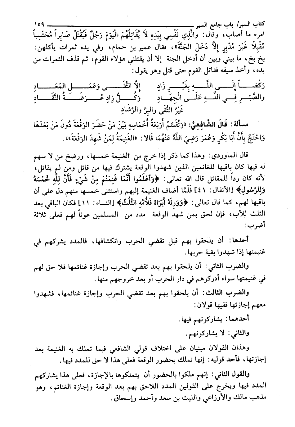 : قال الشافعي: " وَتُقَسَّمُ أَرْبَعَةُ أَخْمَاسِهِ بَيْنَ مَنْ حَضَرَ الْوَقْعَةَ دُونَ مَنْ بَعْدَهَا وَاحْتَجَّ بِأَنَّ أَبَا بَكْرٍ وَعُمَرَ رَضِيَ اللَّهُ عَنْهُمَا قَالَا: " الْغَنِيمَةُ لِمَنْ شَهِدَ الْوَقْعَةَ "