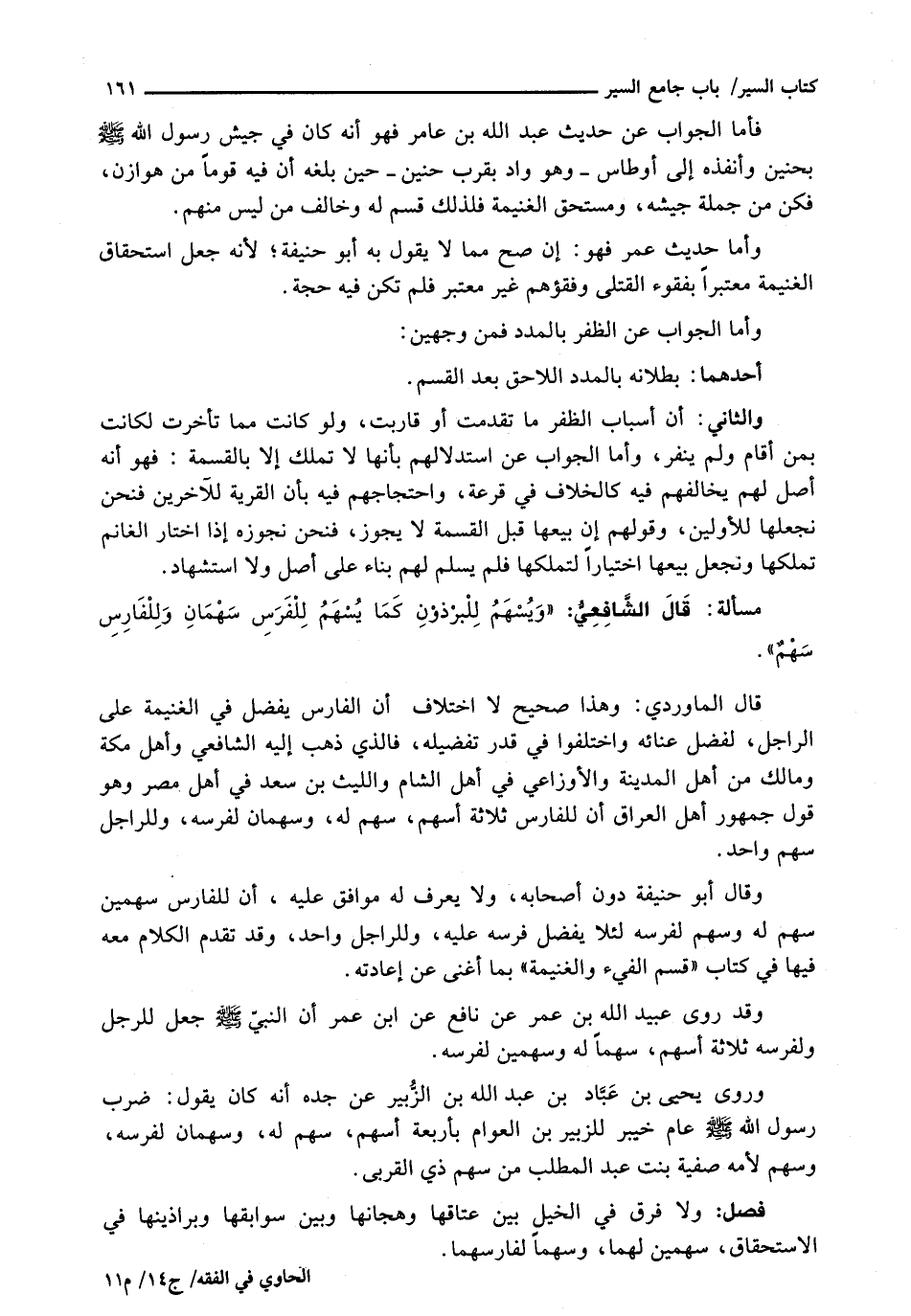 قَالَ الْمَاوَرْدِيُّ: وَهَذَا صَحِيحٌ لَا اخْتِلَافَ أَنَّ الْفَارِسَ يُفَضَّلُ فِي الْغَنِيمَةِ عَلَى الرَّاجِلِ، لِفَضْلِ عَنَائِهِ وَاخْتَلَفُوا فِي قَدْرِ تَفْضِيلِهِ، فَالَّذِي ذَهَبَ إِلَيْهِ الشَّافِعِيُّ وَأَهْلُ مَكَّةَ وَمَالِكٌ مِنْ أَهْلِ الْمَدِينَةِ وَالْأَوْزَاعِيُّ فِي أَهْلِ الشَّامِ وَاللَّيْثُ بْنُ سَعْدٍ فِي أَهْلِ مِصْرَ وَهُوَ قَوْلُ جُمْهُورِ أَهْلِ الْعِرَاقِ أَنَّ لِلْفَارِسِ ثَلَاثَةَ أَسْهُمٍ، سَهْمٌ لَهُ، وَسَهْمَانِ لِفَرَسِهِ، وَلِلرَّاجِلِ سَهْمٌ وَاحِدٌ.