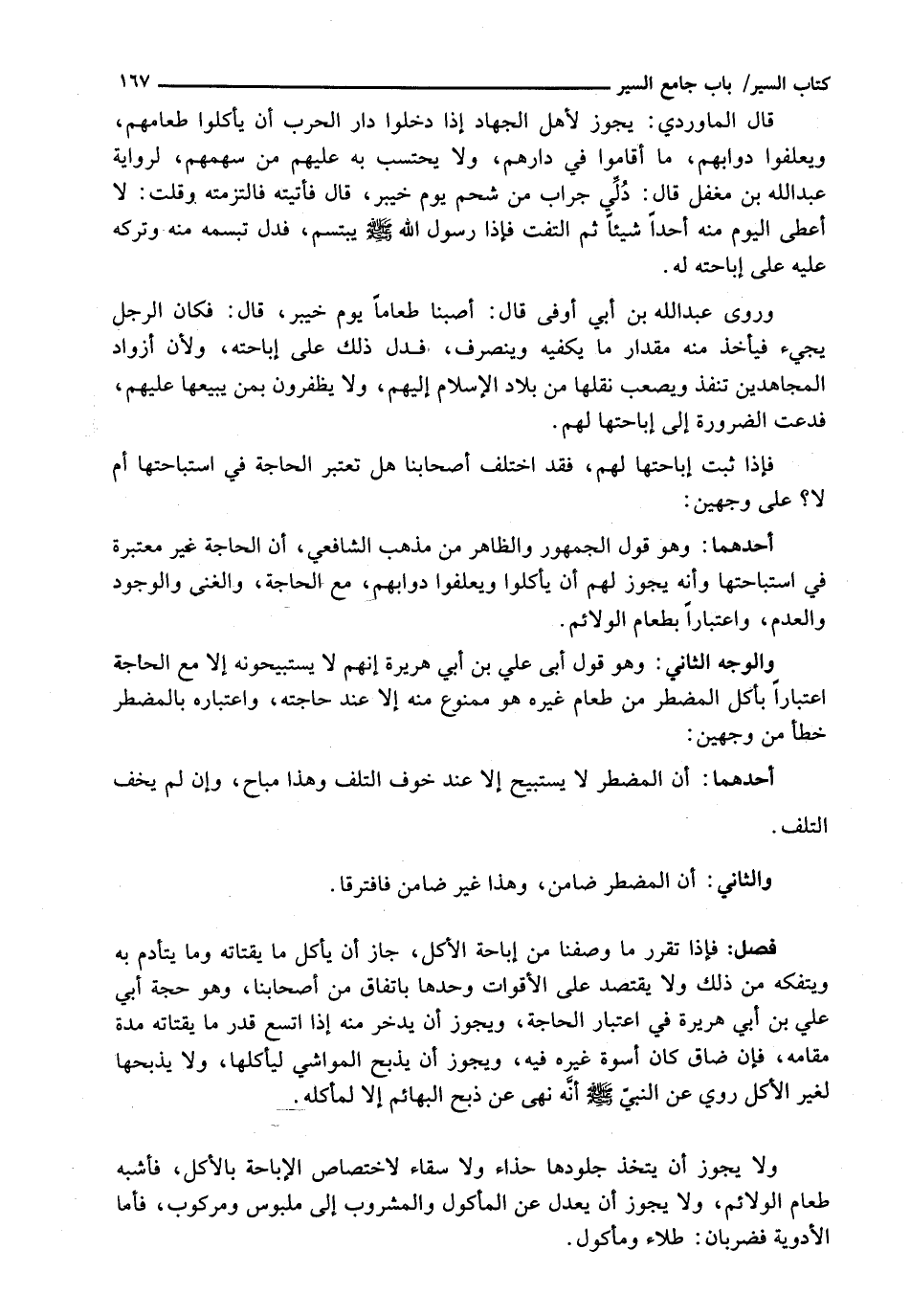وَرَوَى عَبْدُ اللَّهِ بْنُ أَبِي أَوْفَى قَالَ: أَصَبْنَا طَعَامًا يَوْمَ خَيْبَرَ، قَالَ: فَكَانَ الرَّجُلُ يَجِيءُ فَيَأْخُذُ مِنْهُ مِقْدَارَ مَا يَكْفِيهِ وَيَنْصَرِفُ، فَدَلَّ ذَلِكَ عَلَى إِبَاحَتِهِ، وَلِأَنَّ أزواد المجاهدين تنفذ وَيَصْعُبُ نَقْلُهَا مِنْ بِلَادِ الْإِسْلَامِ إِلَيْهِمْ، وَلَا يَظْفَرُونَ بِمَنْ يَبِيعُهَا عَلَيْهِمْ فَدَعَتِ الضَّرُورَةُ إِلَى إِبَاحَتِهَا لَهُمْ.